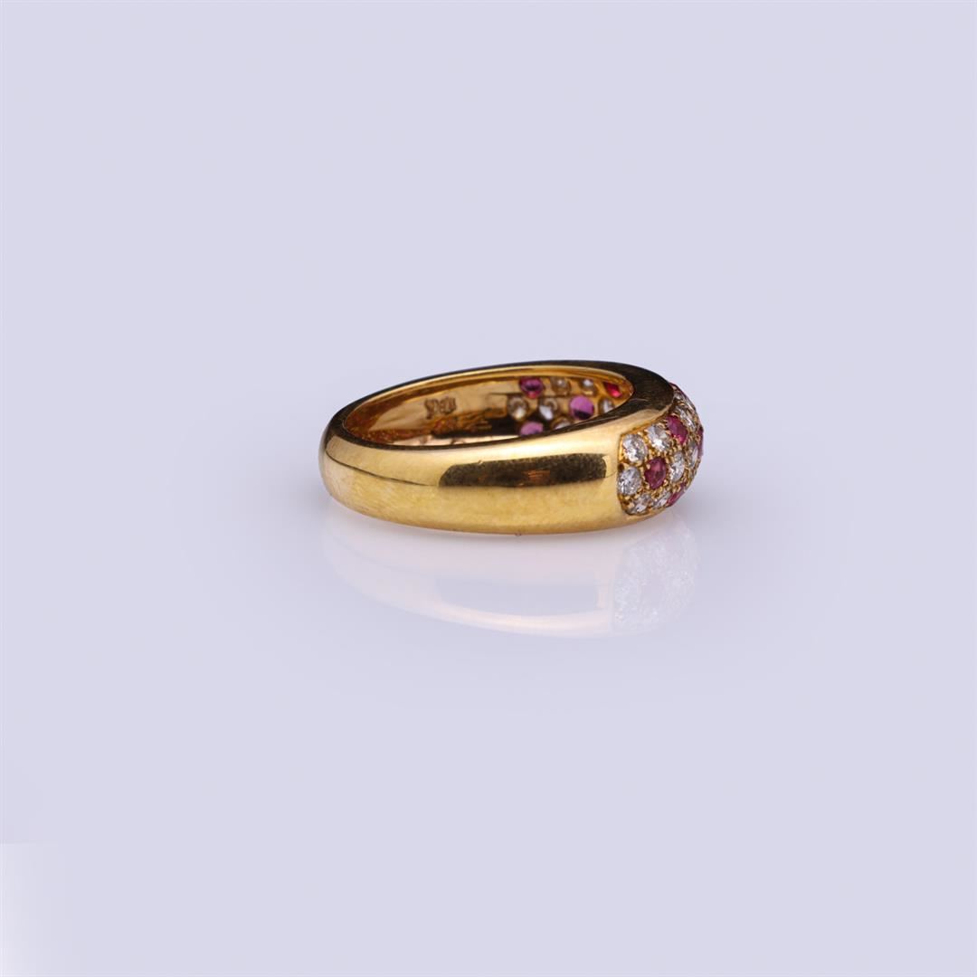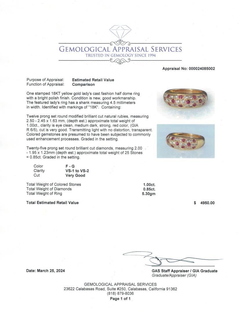 18K Yellow Gold Ruby & Diamond Ring containing twelve rubies weighing approximately 1.00 cts. Twenty five round brilliant cut diamonds weighing approximately 0.85 cts Total weight is 5.3 gm. Estimated retail value $4,950.