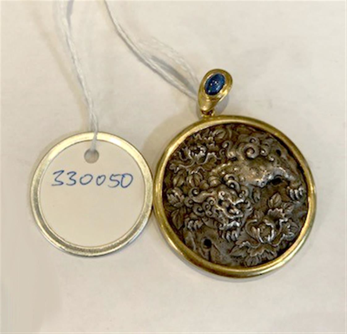 18K Yellow Gold Sapphire & Meiji Period Japanese Silver Manju Pendant containing oval sapphire weighing approximately 0.50 cts. Total weight is 23.5 gm. Estimated retail value $1,280.