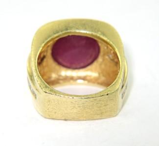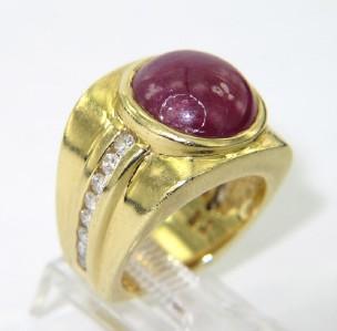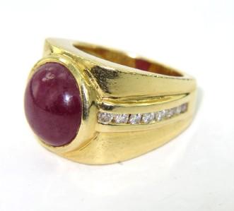 18K Yellow Gold with Cabochon Ruby and Diamond ring. The total ring weight is 17.2 grams. The total diamond weight is 0.75 cts ,approxmiately. H color, VS clarity. The total of cabochon Ruby weight: 10 cts and size of cabochon Ruby: 10 x 10 mm. The ring is 5 - 12 mm wide. The size of ring: 5.75