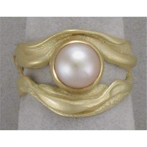 This exquisite ring by designer Norah Pierson is 18K gold and set with an 8MM cultured freshwater pearl in pale pink. It is a size 6 3/4 and weighs 7.7 grams.