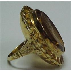 18K gold and citrine cameo ring, large custom mounting set with citrine carved and frosted cameo of a woman, perimeter is set with 24 bezel set citrines, four stones are chipped, ring measures 1 1/4" by 1 1/8", wt. 10.2 dwt/15.9 g Estimate 300/450
