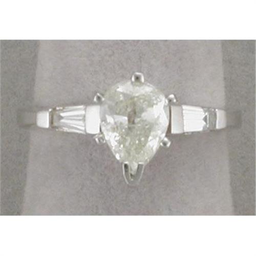 Very pretty 18K white gold, pear-shaped diamond ring. The center diamond has many small white inclusions (in the I range for clarity) and the I-J color range, and measures approximately 7.2 x 5.4MM and is estimated to weigh .96 carats. It is flanked by two tapered baguette diamonds of approximatlely .10 carat each for an estimated total weight of approximately 1.16 carat. It is a size 5 1/4 and weighs 3.4 grams.