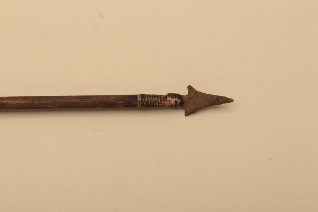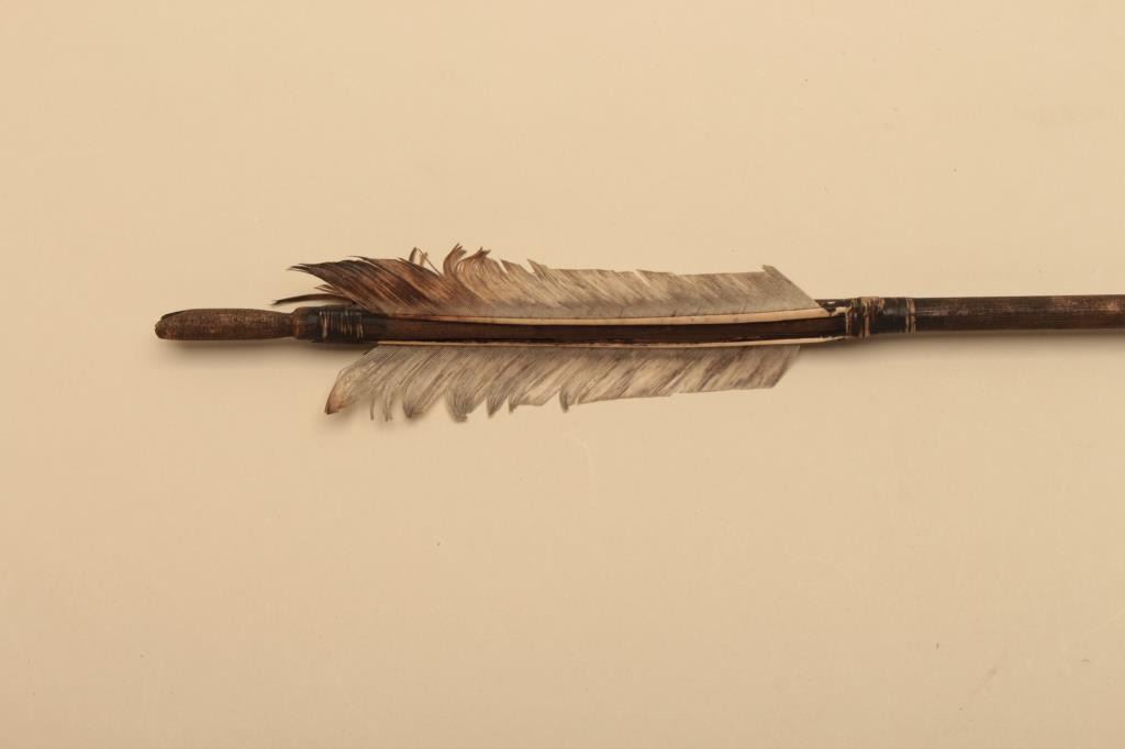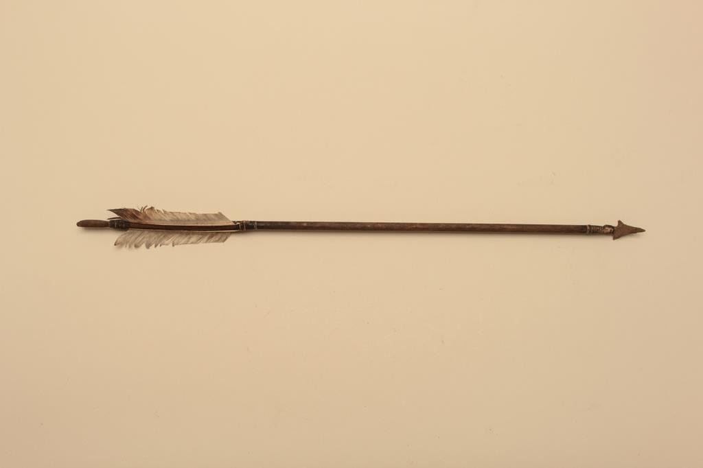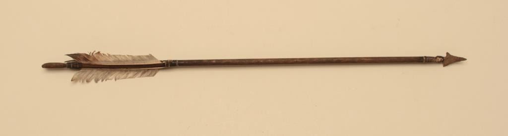 An antique possibly Native American arrow with beautiful razor sharp flint head, wood shaft and feather fletching. In fine original condition, the three feathers somewhat damaged as to be expected after so manyyears. A rare survival excellent for display. Est.: $100-$200