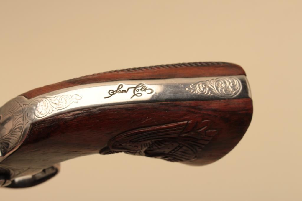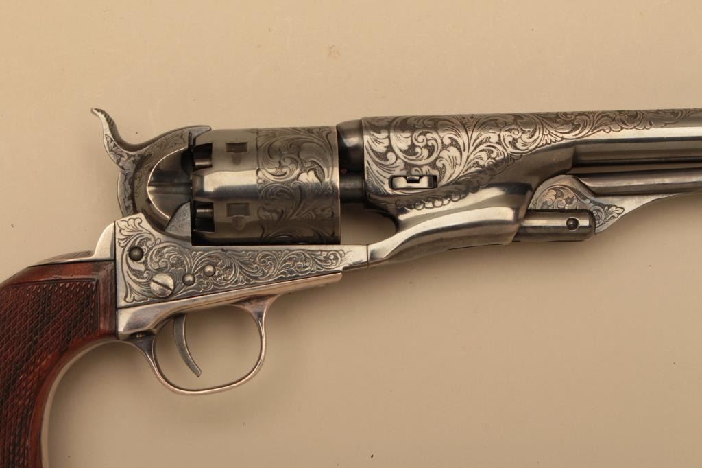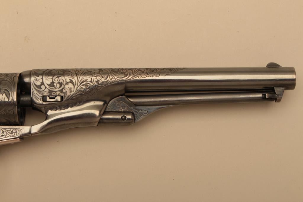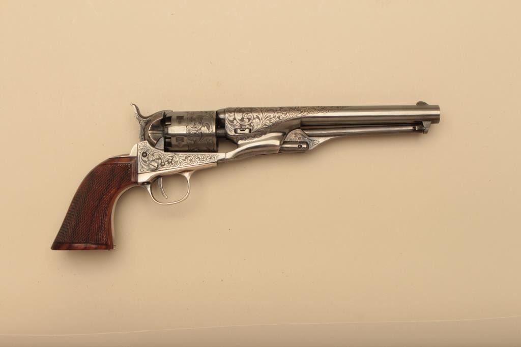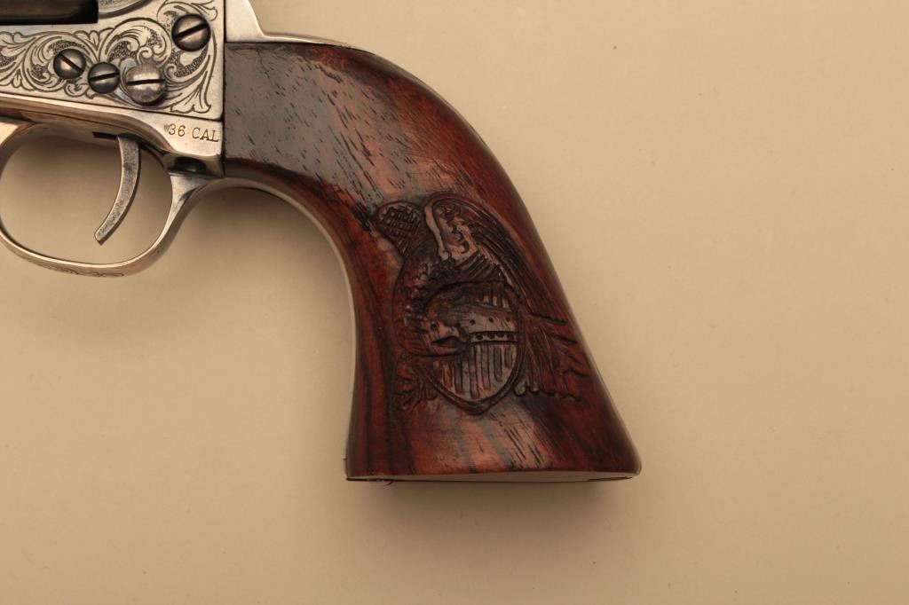 Colt 1861 Navy New Blackpowder series revolver, George Custer Series, engraved with silver finish, carved wood grips showing American eagle on the left 4 screw cut for stock frame. .36 caliber percussion with a 7½” barrel, S/N 45386. Sam’L Colt in script on backstrap. Excellent condition with finish toned to blue/black. (Percussion) Est.: $1500-$3000