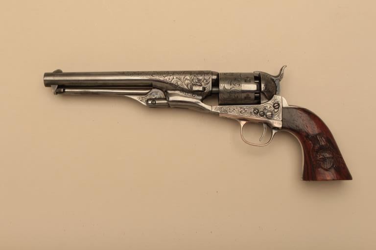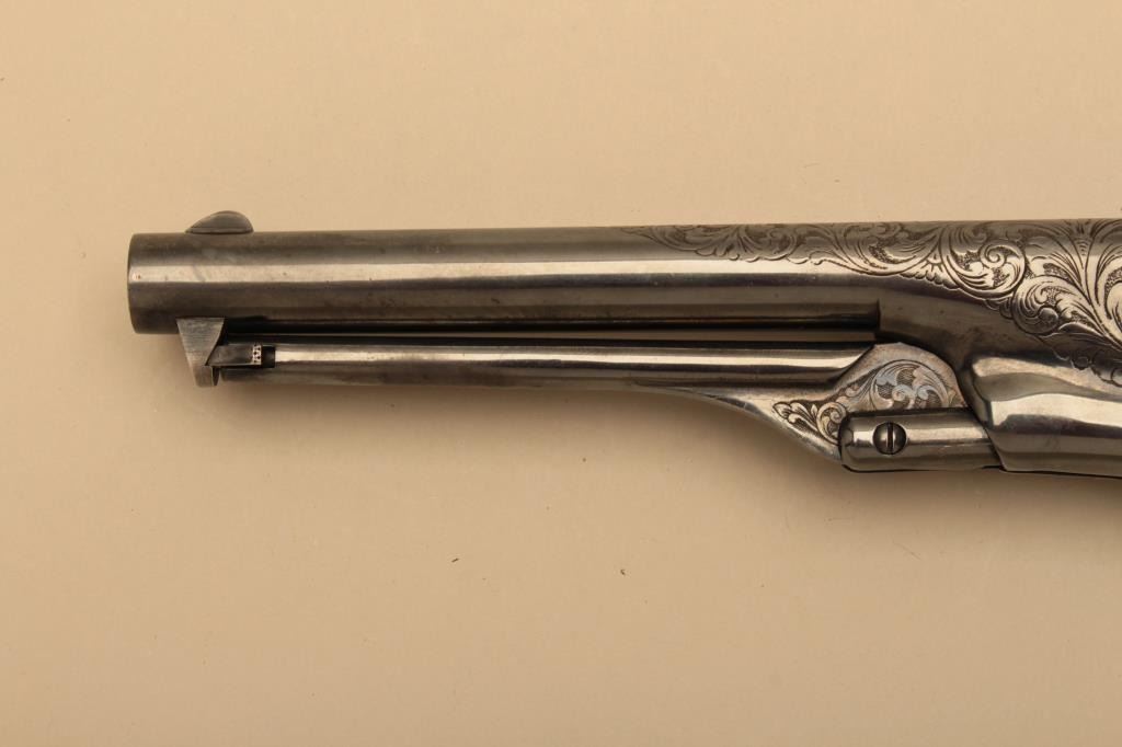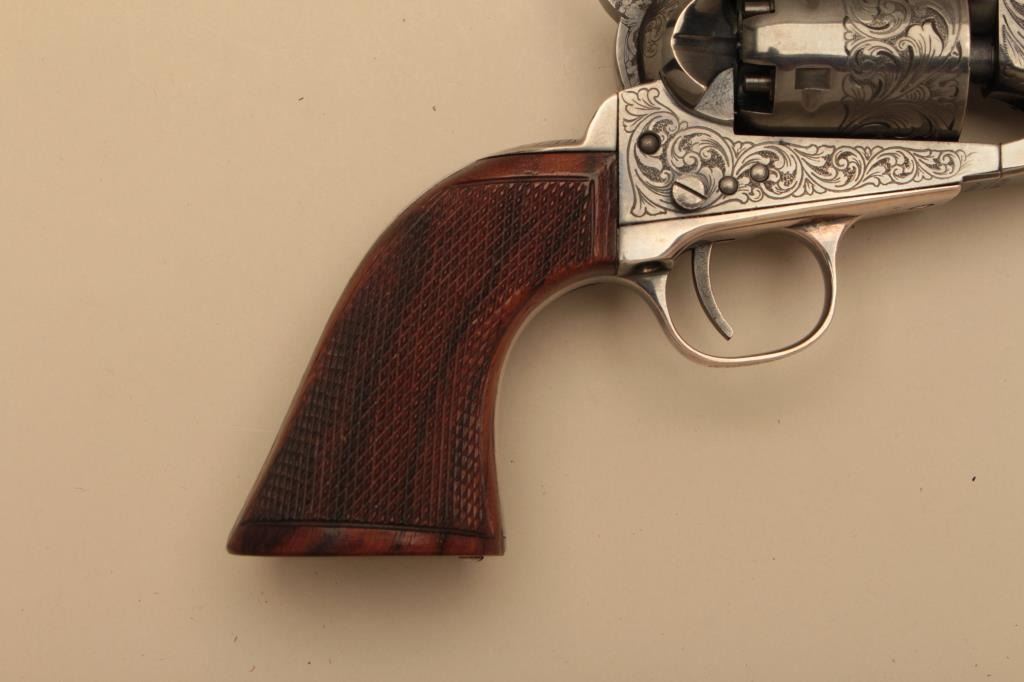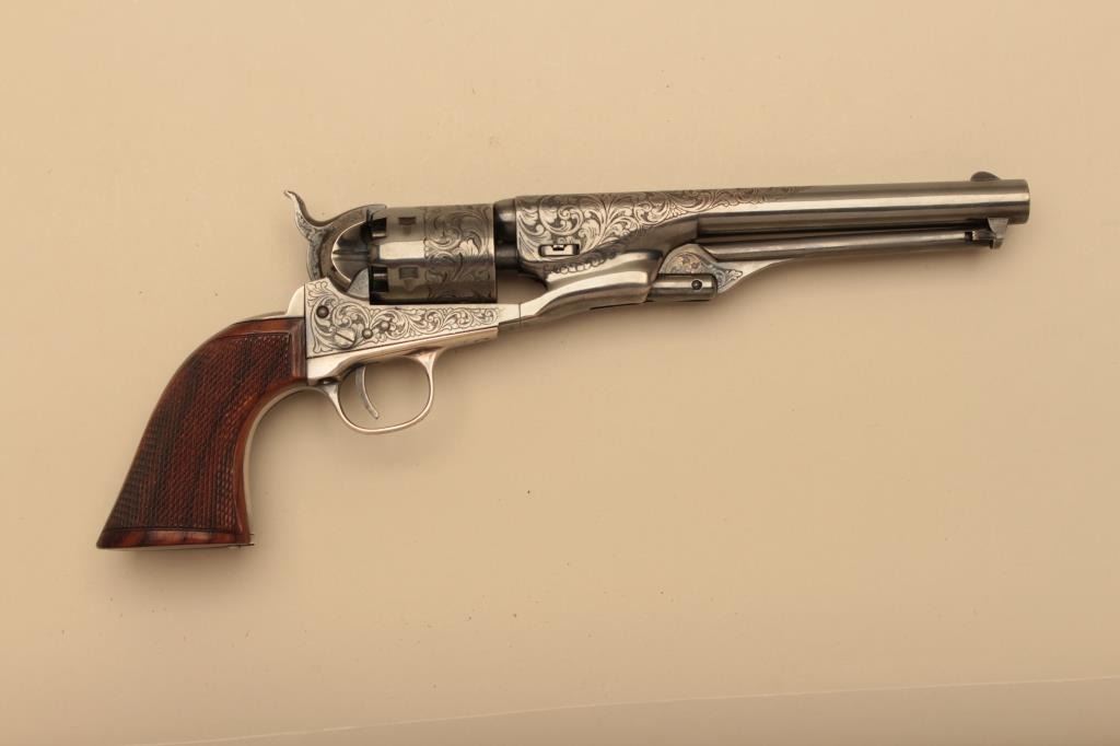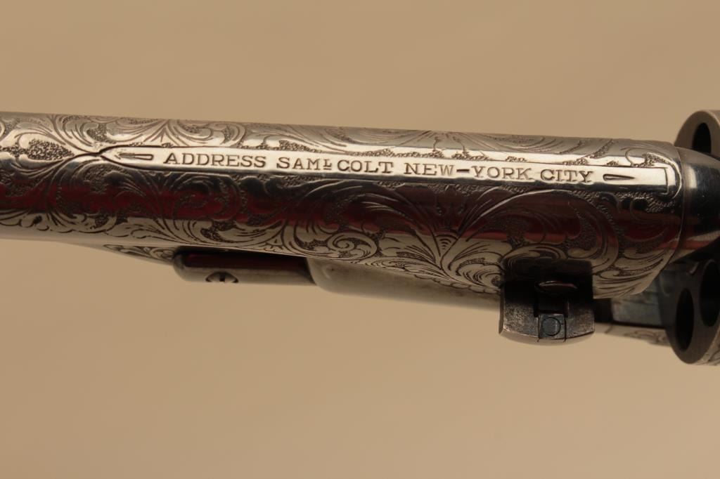 Colt 1861 Navy New Blackpowder series revolver, George Custer Series, engraved with silver finish, carved wood grips showing American eagle on the left 4 screw cut for stock frame. .36 caliber percussion with a 7½” barrel, S/N 45386. Sam’L Colt in script on backstrap. Excellent condition with finish toned to blue/black. (Percussion) Est.: $1500-$3000