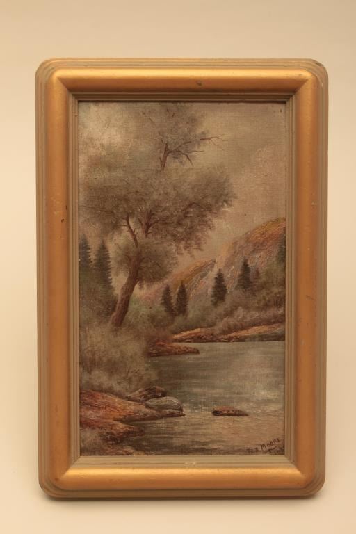 Pair of landscape paintings signed lower right βTex Moore 1935β with trail skull vignette. Approximately 12 ½β x 7 ½β in vintage frames needing minor cleaning. Canvas laid down on board. John Moore painted nearYellowstone and in Wyoming and Montana. He was self-taught and encouraged by Frederic Remington. Born near Ft. Worth, TX his father pioneered the Abilene Trail. He was a real cowboy, Texas Ranger, and Indian scout forGen. Crook. In 1935 he was designated the official cowboy artist of the Lone Star state. John Moore was born 1866 and died 1948. Est.: $1500-$3000