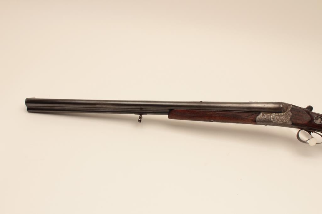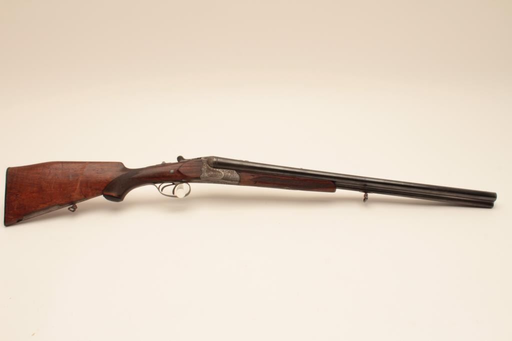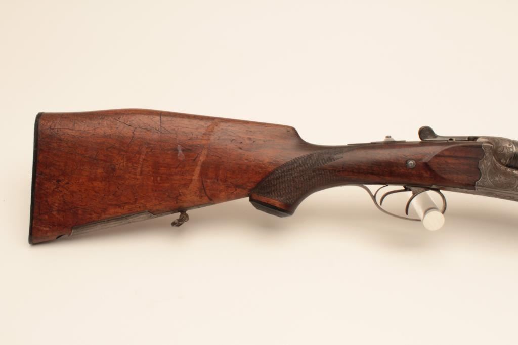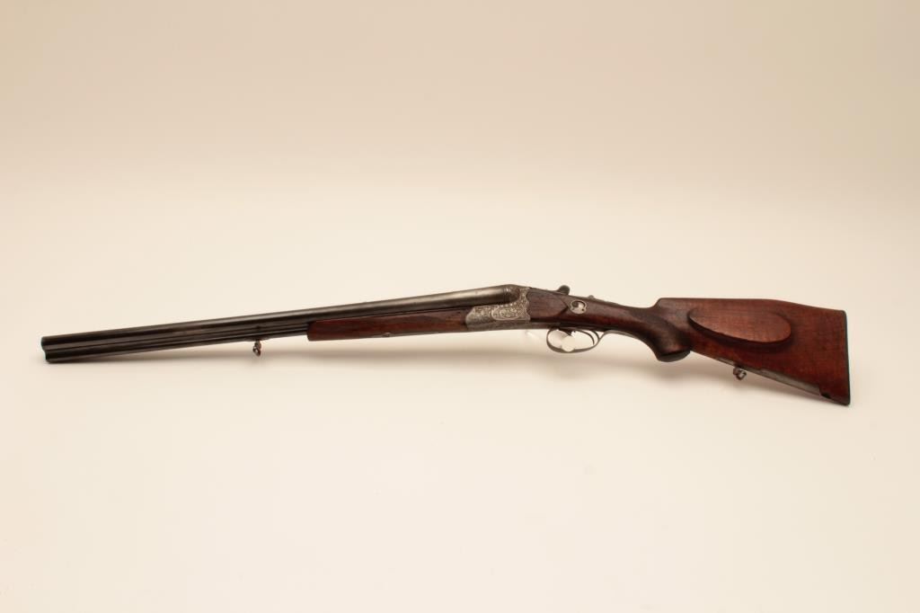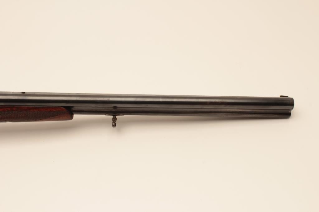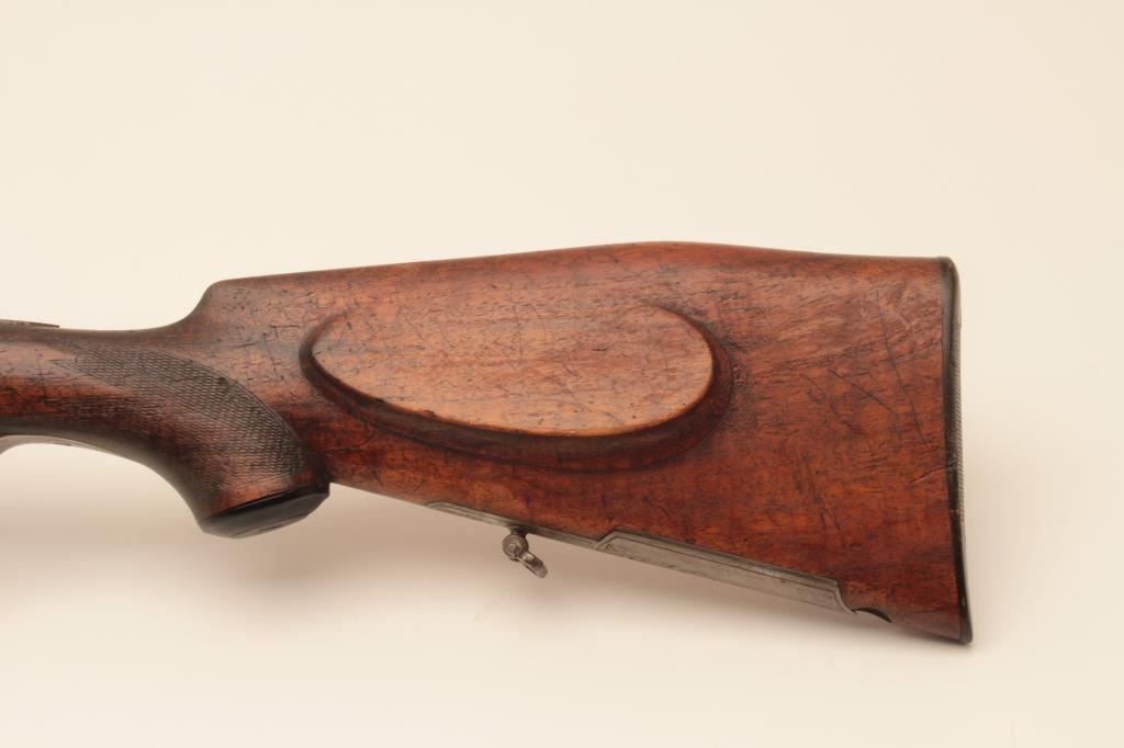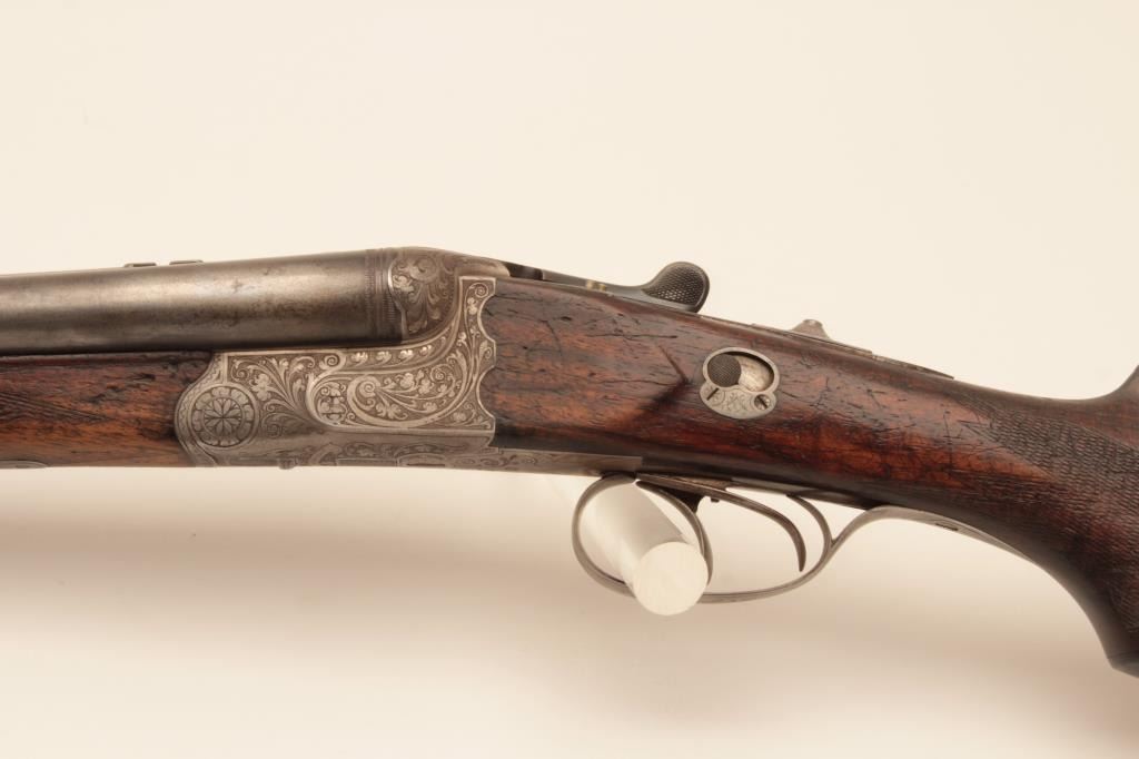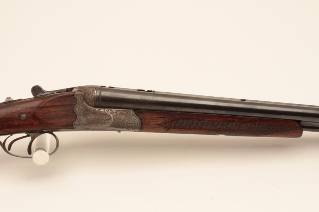 Sempert Krieghoff marked German 3 barrel drilling in 16GA over 8x72 caliber, S/N 16421. Pre-War Suhl proofs. Engraved frame with classic German features and side safety. Measures almost 41” overall with a 23 ½”barrel. Approximately 50%-60% original blue and traces of case colors. The stocks are worn and fair to good. The bores are bright and the rear sight pops up when rifle barrel is engaged. Would restore very well.(Antique) Est.: $900-$1800