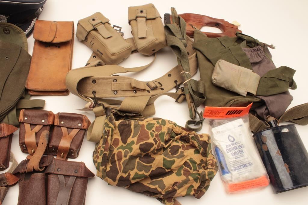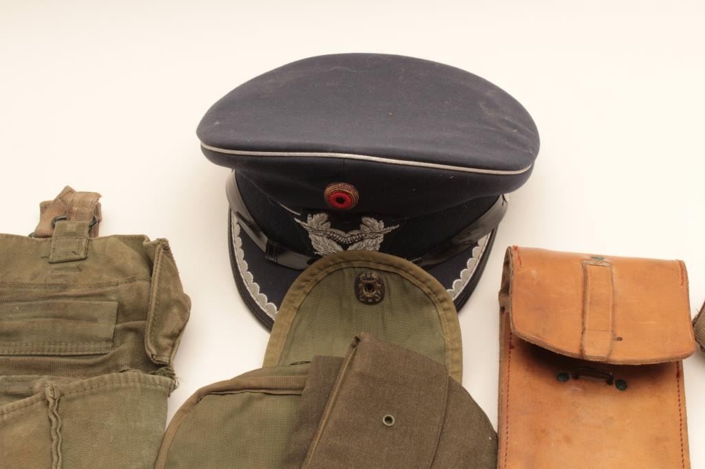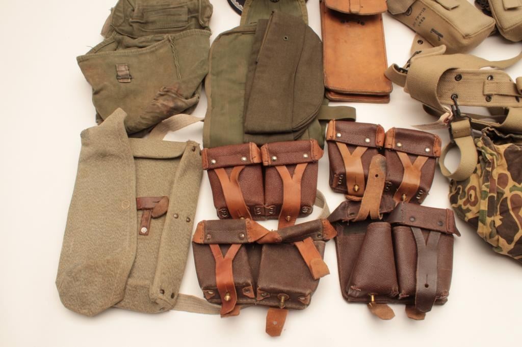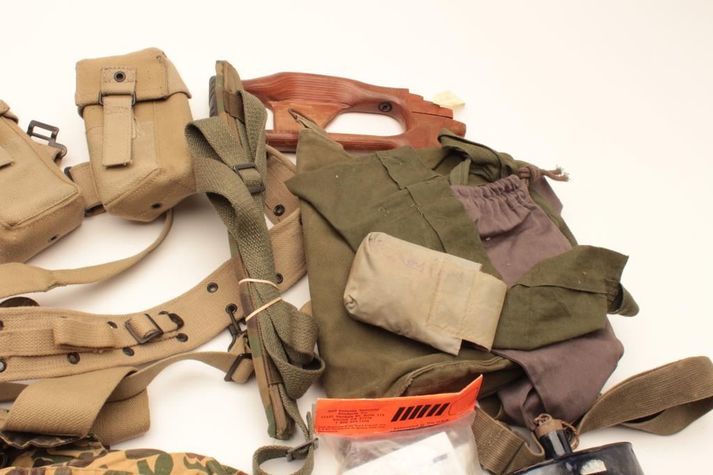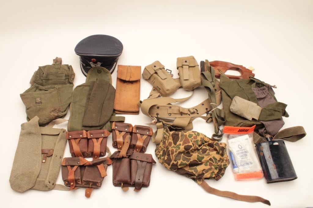 Bonanza lot of military web gear, magazine pouches, hats, oilers etc. The lot includes leather magazine pouches, oilers, wooden buttstock for an AK-74, OD green canvas bandoliers, caps and officers hats. All ingood overall condition showing use and wear. Est.: $100-$200.
