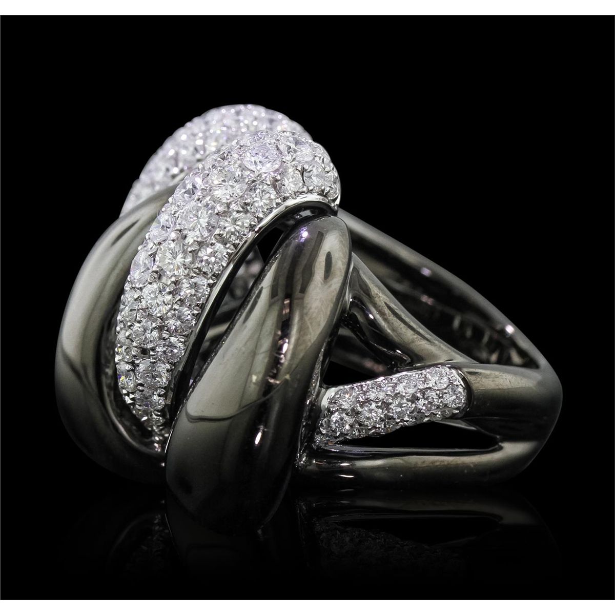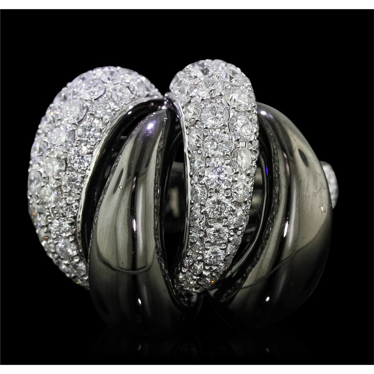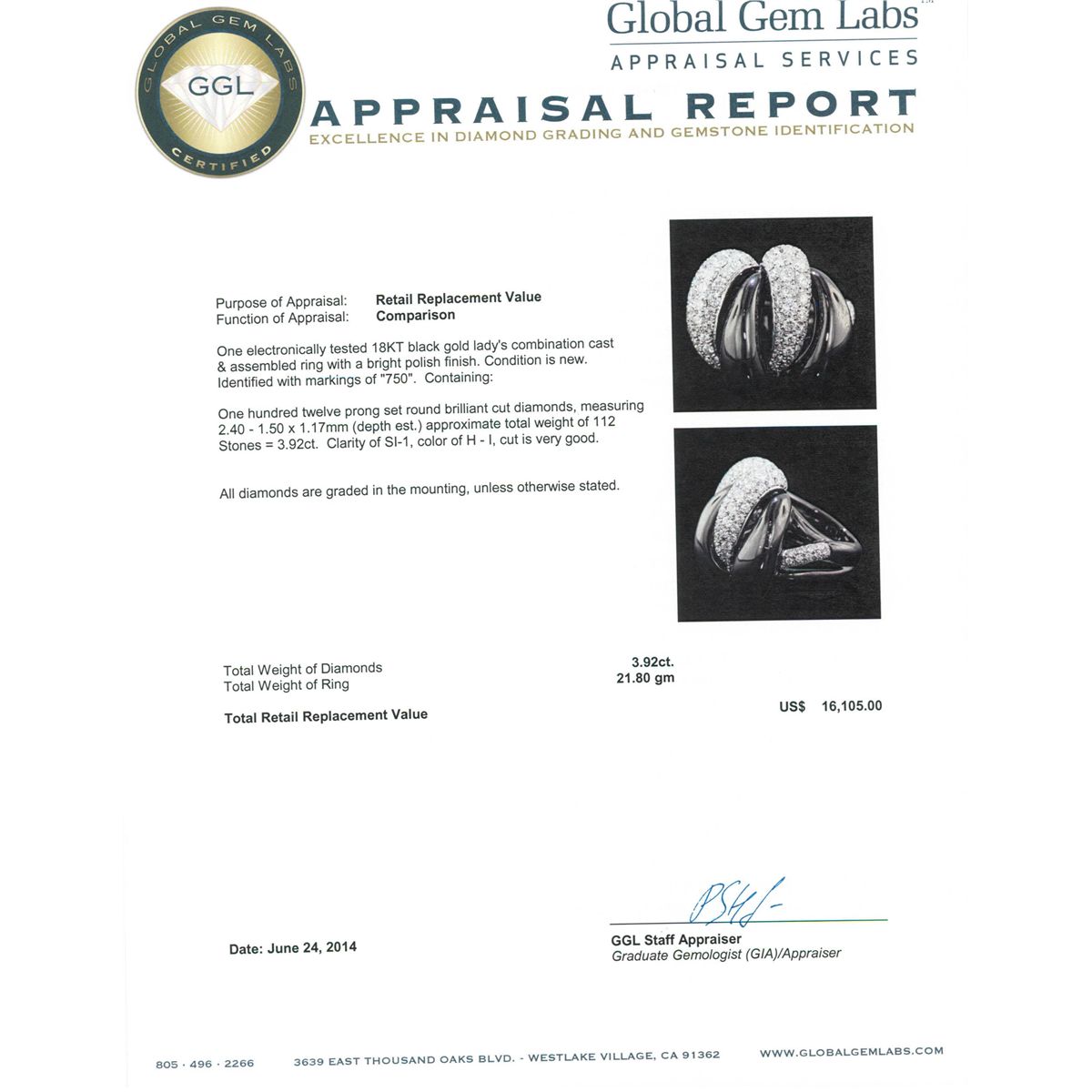 One electronically tested 18KT black gold Ladies combination cast & assembled ring with a bright polish finish. Condition is new. Identified with markings of "750". Containing: One Hundred Twelve prong set round brilliant cut diamonds, measuring 2.40 - 1.50 x 1.17mm (depth est.) approximate. Total Weight of 112 Stones = 3.92ct. Clarity: SI-1. Color: H - I, Cut is Very Good. All diamonds are graded in the mounting, unless otherwise stated. Total Weight of Diamonds 3.92ct. Total Weight of Ring 21.80 grams. GGL Appraised at $16,105.00.