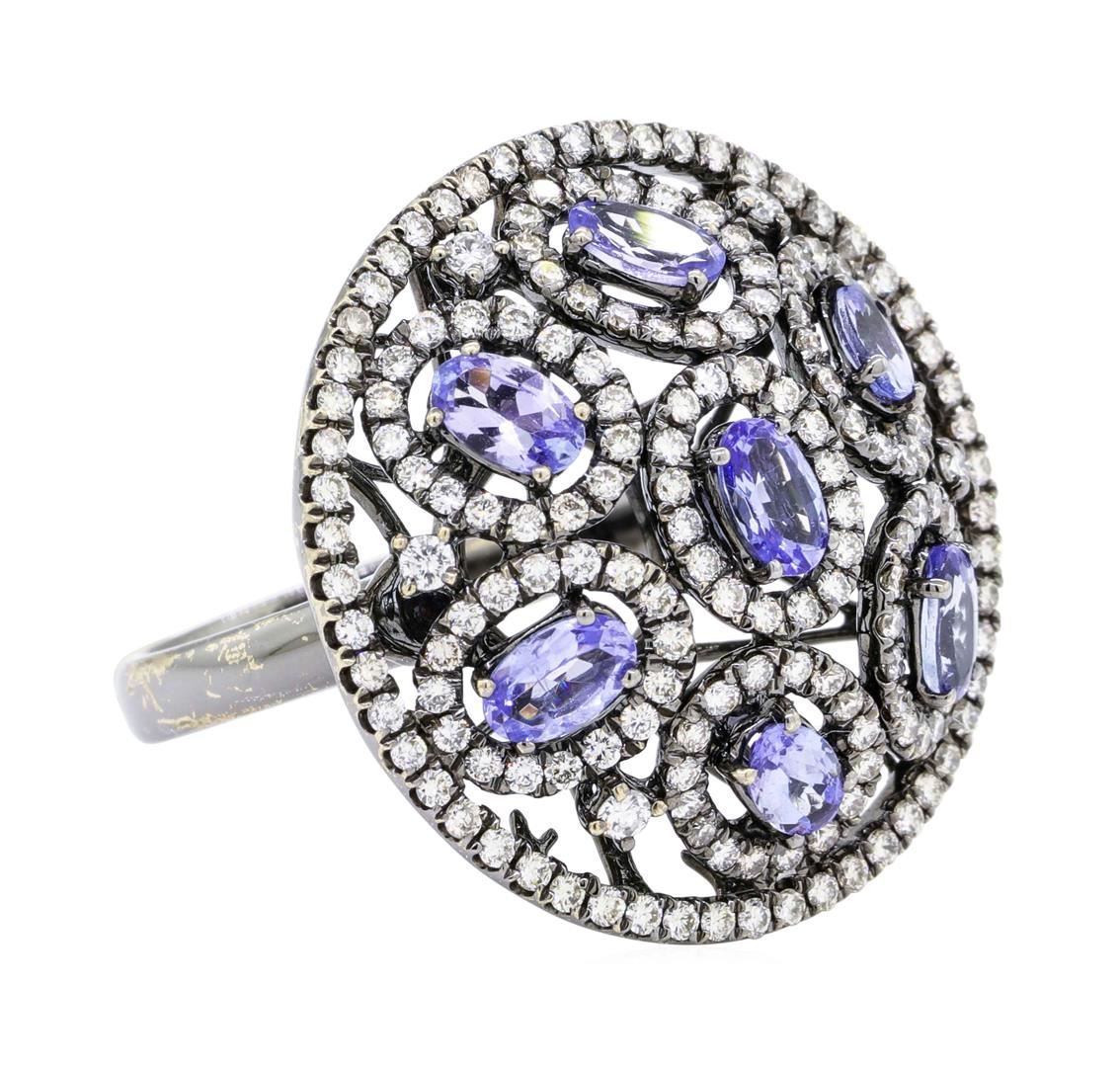 One electronically tested 18KT black rhodium gold lady's cast fashion cocktail ring with a bright polish finish. The featured lady's ring has a shank measuring 3.00 millimeters wide. Identified with markings of '18K'. Condition is new, good workmanship. Containing: Seven prong set oval modified mixed cut natural tanzanites, measuring 5.00 x 3.00 x 1.95mm, (depth est.) approximate total weight of 1.50ct., clarity is eye clean, medium light, very slightly grayish, bluish violet color, (GIA bV 4/3), cut is good. Transmitting light with no distortion, transparent. Colored gemstones are presumed to have been subjected to commonly used enhancement processes. Graded in the setting. Five prong set round brilliant cut diamonds, measuring 1.70 - 1.65 x 1.04mm (depth est.) approximate total weight of 5 Stones = 0.09ct. Graded in the setting. Color H - I Clarity VS-1 to VS-2 Cut Very Good One Hundred Sixty-Eight prong set round brilliant cut diamonds, measuring 1.30 - 1.20 x 0.78mm (depth est.) approximate total weight of 168 Stones = 1.25ct. Graded in the setting. Color H - I Clarity VS-2 to SI-2 Cut Very Good. Total Weight of Colored Stones 1.50ct.. Total Weight of Diamonds 1.34ct.. Total Weight of Ring 9.90gm. GAS Appraised.