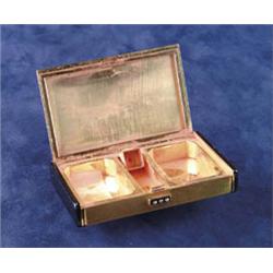Lot 102 18KT COMPACT BOX BY CARTIER, PARIS This fabulous 18kt yellow gold and black enamel compact box by Cartier, Paris is a rectangular hinged box having black enamel ends and three diamond and black enamel clasp. Lid opens to reveal an inside area of the top which has a gold frame and once probably held a mirror which is not present. The bottom interior having two cut corner powder wells and brush holder. Marked “Cartier Paris” with French hallmarks. WEIGHT: 4.9 tr oz. SIZE: 2-1/4” x 3-1/2”. CONDITION: Small chips to edges of black enamel ends, missing mirror and brush. Otherwise good. 5-70821