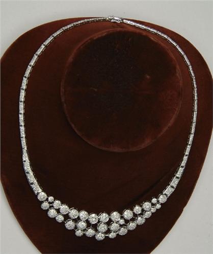 18KT DIAMOND NECKLACE. Beautiful 18kt white gold necklace is encrusted with pavee set round single cut diamonds. Total diamond weight is approx. 6.30ct. Necklace is 16 in. l and has a concealed double safety clasp. CONDITION: Very good to excellent. 5-61587