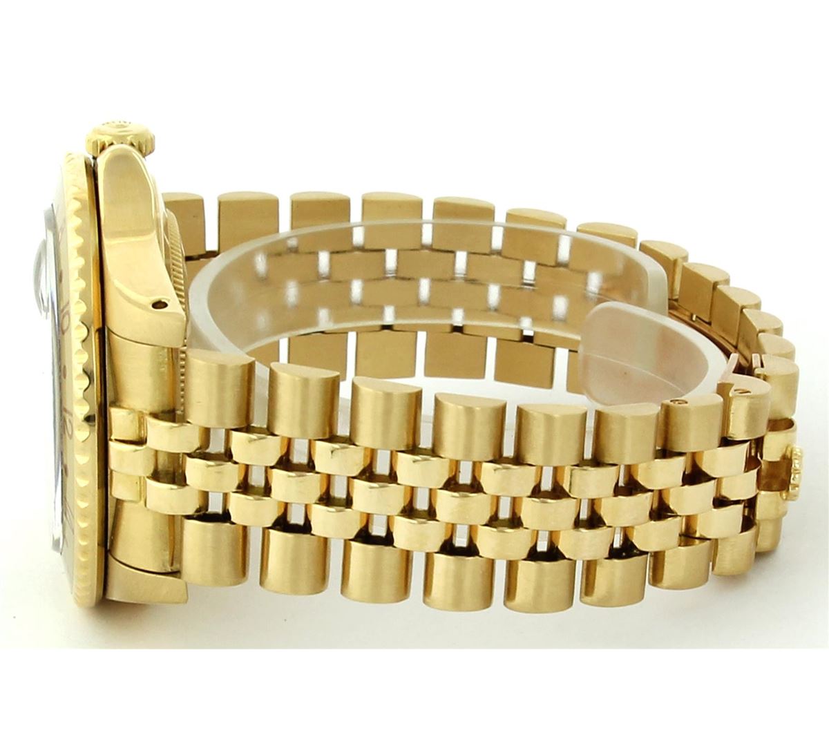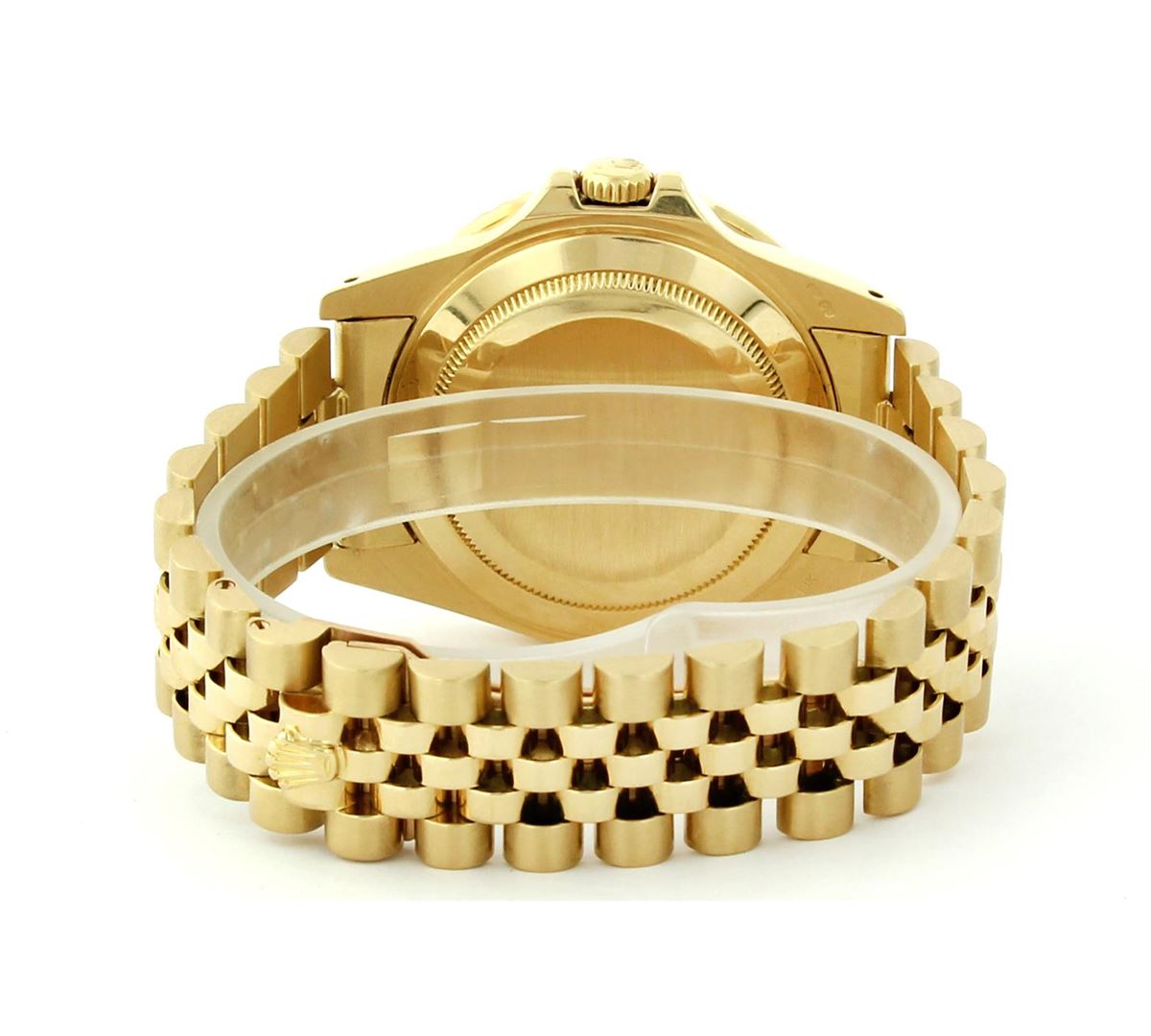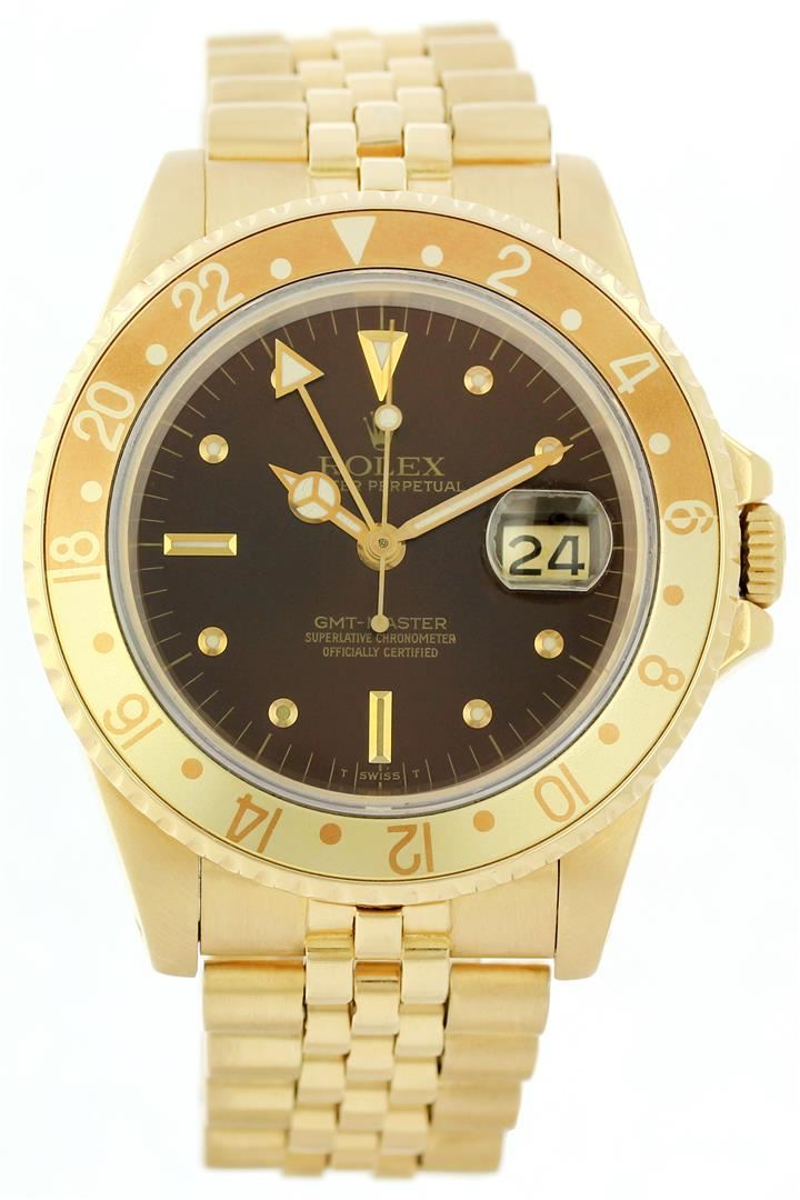 One Gents Rolex GMT Master Polished Bright with Satin Finish, Serviced & Electronically Tested, 18K Yellow Gold Case:40mm, 18K Yellow Gold Crown, Bezel: 18K Yellow Gold Brown Rotating GMT Bezel. Crystal: Acrylic Lens. Movement: Automatic Winding Movement Caliber 3075. Dial: Brown "Root Beer" GMT Dial With GMT Hand. Date Window: 3 O'Clock Position Date Display, Quickset, Model: 16753 Condition: G-6 Extra Fine. Bracelet: 18K Yellow Gold Jubilee. Bright Polish & Satin Finish. 6.5 Inch Length, Adjustable. Standard Clasp, With Rolex Logo.
