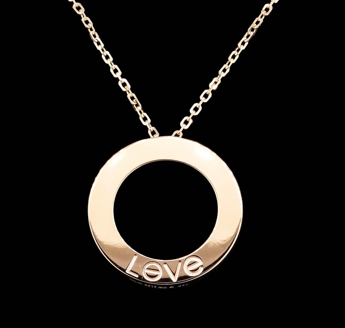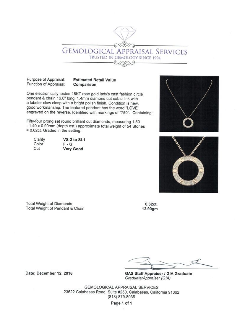 One electronically tested 18KT rose gold lady's cast fashion circle pendant & chain 16.0" long, 1.4mm diamond cut cable link with a lobster claw clasp with a bright polish finish. The featured pendant has the word "LOVE" engraved on the reverse. Identified with markings of "750". Condition is new, good workmanship. Containing: Fifty-Four prong set round brilliant cut diamonds, measuring 1.50 - 1.40 x 0.90mm (depth est.) approximate total weight of 54 Stones = 0.62ct. Graded in the setting. Clarity: VS-2 to SI-1. Color: F - GCut Very Good. Total Weight of Diamonds 0.62ct. Total Weight of Pendant & Chain 12.90gm. GAS Appraised.