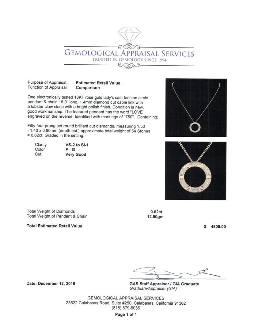 One electronically tested 18KT rose gold lady's cast fashion circle pendant & chain 16.0" long, 1.4mm diamond cut cable link with a lobster claw clasp with a bright polish finish. The featured pendant has the word "LOVE" engraved on the reverse. Identified with markings of "750". Condition is new, good workmanship. Containing: Fifty-Four prong set round brilliant cut diamonds, measuring 1.50 - 1.40 x 0.90mm (depth est.) approximate total weight of 54 Stones = 0.62ct. Graded in the setting. Clarity: VS-2 to SI-1. Color: F - GCut Very Good. Total Weight of Diamonds 0.62ct. Total Weight of Pendant & Chain 12.90gm. GAS Appraised at $4,805.00.