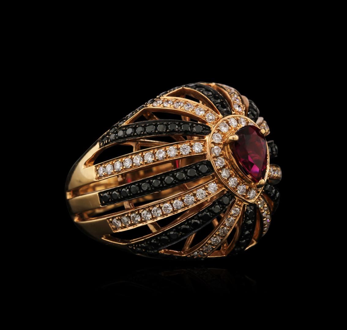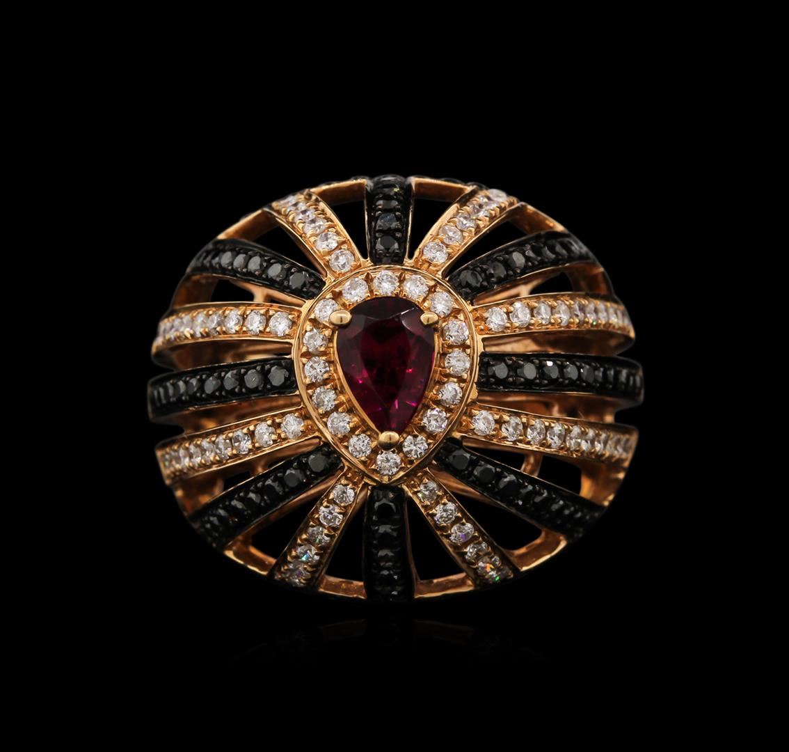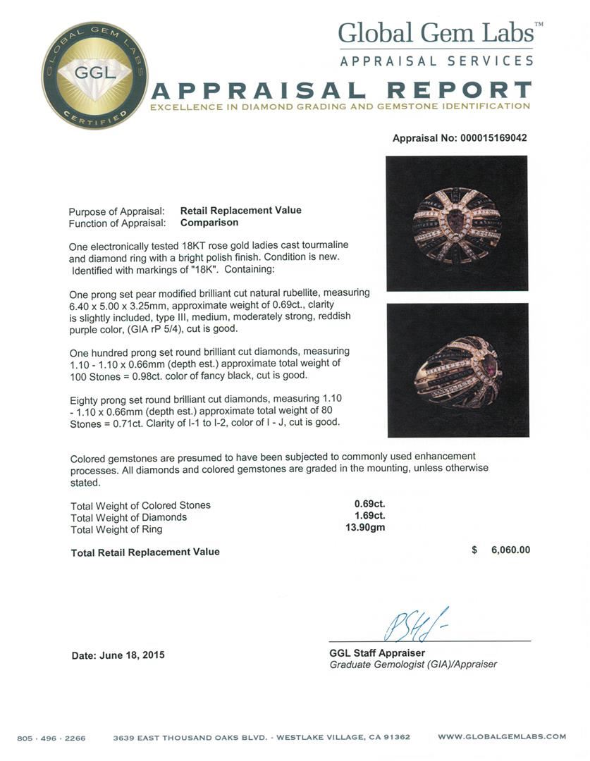One electronically tested 18KT rose gold ladies cast tourmaline and diamond ring with a bright polish finish. Identified with markings of "18K". Condition is new. Containing: One prong set pear modified brilliant cut natural rubellite, measuring 6.40 x 5.00. x 3.25mm, approximate weight of 0.69ct., clarity is slightly included, type III, medium, moderately strong, reddish purple color, (GIA rP 5/4), cut is good. One Hundred prong set round brilliant cut diamonds, measuring 1.10 - 1.10 x 0.66mm (depth est.) approximate total weight of 100 Stones = 0.98ct. Cut is Good. Eighty prong set round brilliant cut diamonds, measuring 1.10 - 1.10 x 0.66mm (depth est.) approximate total weight of 80 Stones = 0.71ct. Clarity: I-1 to I-2. Color: I - J, Cut is Good. Colored gemstones are presumed to have been subjected to commonly used enhancement processes. All diamonds and colored gemstones are graded in the mounting, unless otherwise stated. Total Weight of Colored Stones 0.69ct. Total Weight of Diamonds 1.69ct. Total Weight of Ring 13.90 grams. GGL Appraised at $6,060.00.