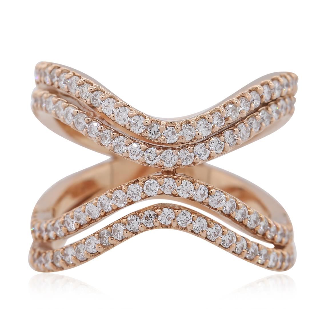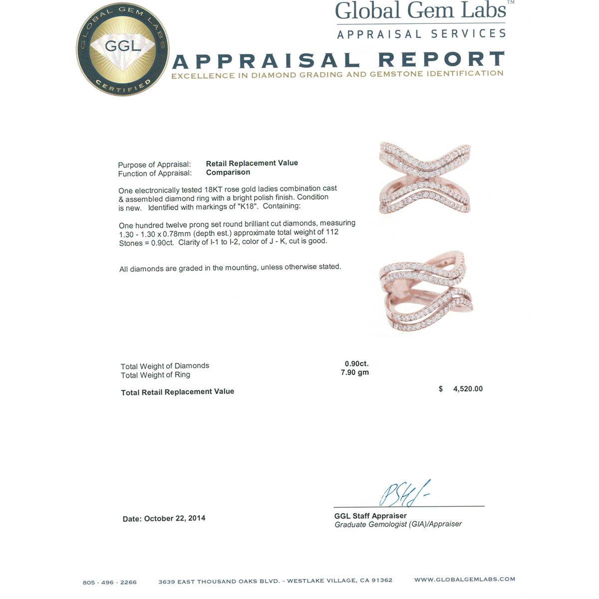 One electronically tested 18KT rose gold ladies combination cast & assembled diamond ring with a bright polish finish. Identified with markings of "K18". Condition is new. Containing: One Hundred Twelve prong set round brilliant cut diamonds, measuring 1.30 - 1.30 x 0.78mm (depth est.) approximate total weight of 112 Stones = 0.90ct. Clarity: I-1 to I-2. Color: J - K, Cut is Good. All diamonds are graded in the mounting, unless otherwise stated. Total Weight of Diamonds 0.90ct. Total Weight of Ring 7.90 grams. GGL Appraised at $4,520.00.