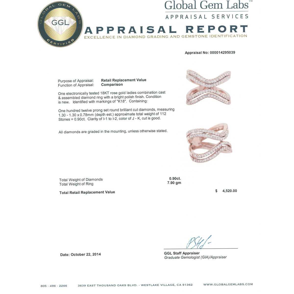One electronically tested 18KT rose gold ladies combination cast & assembled diamond ring with a bright polish finish. Identified with markings of "K18". Condition is new. Containing: One Hundred Twelve prong set round brilliant cut diamonds, measuring 1.30 - 1.30 x 0.78mm (depth est.) approximate total weight of 112 Stones = 0.90ct. Clarity: I-1 to I-2. Color: J - K, Cut is Good. All diamonds are graded in the mounting, unless otherwise stated. Total Weight of Diamonds 0.90ct. Total Weight of Ring 7.90 grams. GGL Appraised at $4,520.00.