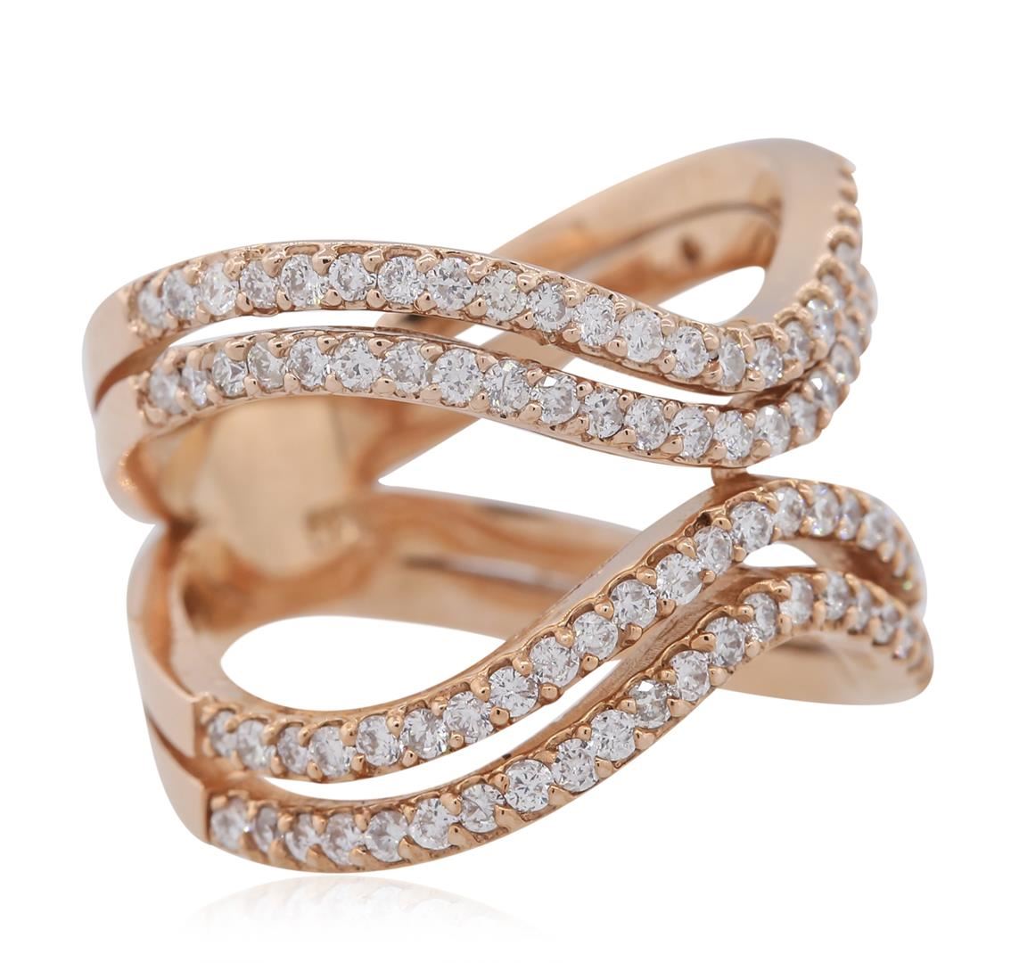 One electronically tested 18KT rose gold ladies combination cast & assembled diamond ring with a bright polish finish. Identified with markings of "K18". Condition is new. Containing: One Hundred Twelve prong set round brilliant cut diamonds, measuring 1.30 - 1.30 x 0.78mm (depth est.) approximate total weight of 112 Stones = 0.90ct. Clarity: I-1 to I-2. Color: J - K, Cut is Good. All diamonds are graded in the mounting, unless otherwise stated. Total Weight of Diamonds 0.90ct. Total Weight of Ring 7.90 grams. GGL Appraised at $4,520.00.