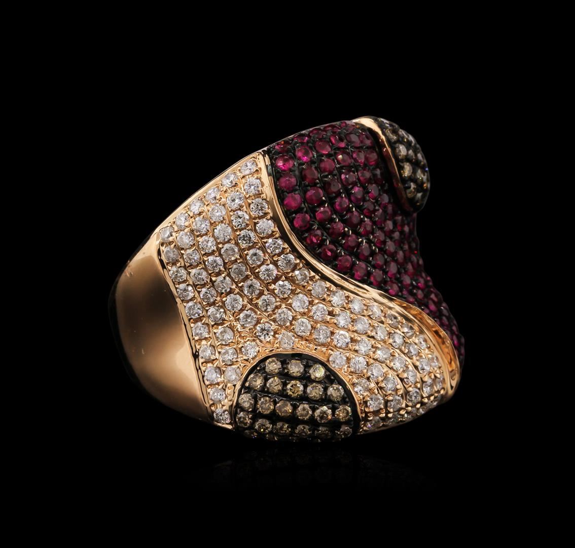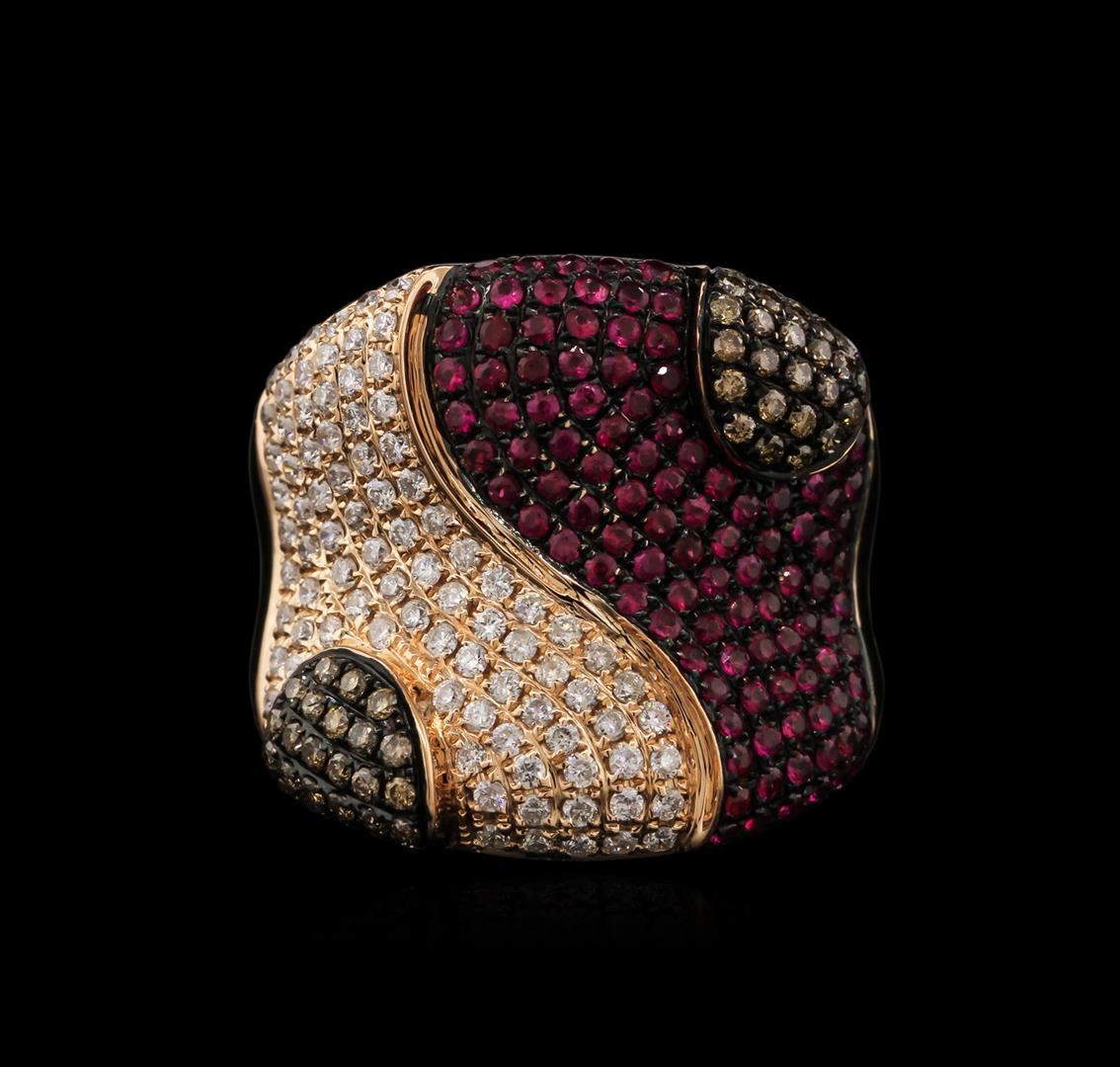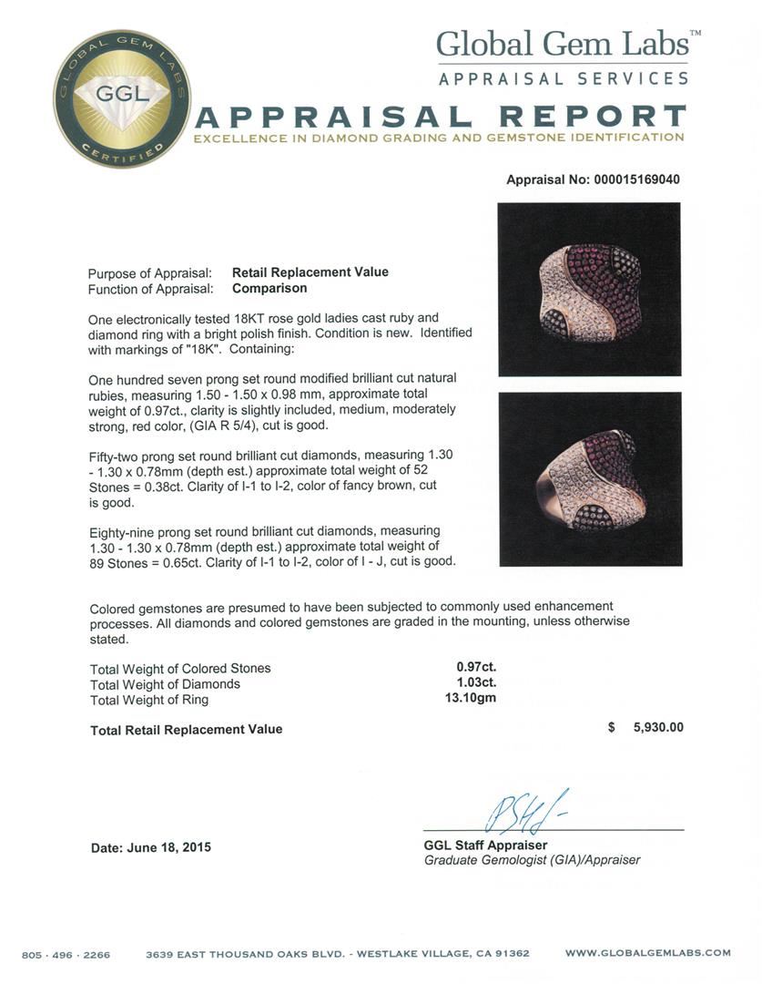 One electronically tested 18KT rose gold ladies cast ruby and diamond ring with a bright polish finish. Identified with markings of "18K". Condition is new. Containing: One hundred seven prong set round modified brilliant cut natural rubies, measuring 1.50 - 1.50 x 0.98 mm, approximate total weight of 0.97ct., clarity is slightly included, medium, moderately strong, red color, (GIA R 5/4), cut is good. Fifty-Two prong set round brilliant cut diamonds, measuring 1.30 - 1.30 x 0.78mm (depth est.) approximate total weight of 52 Stones = 0.38ct. Clarity: I-1 to I-2, Cut is Good. Eighty-Nine prong set round brilliant cut diamonds, measuring 1.30 - 1.30 x 0.78mm (depth est.) approximate total weight of 89 Stones = 0.65ct. Clarity: I-1 to I-2. Color: I - J, Cut is Good. Colored gemstones are presumed to have been subjected to commonly used enhancement processes. All diamonds and colored gemstones are graded in the mounting, unless otherwise stated. Total Weight of Colored Stones 0.97ct. Total Weight of Diamonds 1.03ct. Total Weight of Ring 13.10 grams. GGL Appraised at $5,930.00.