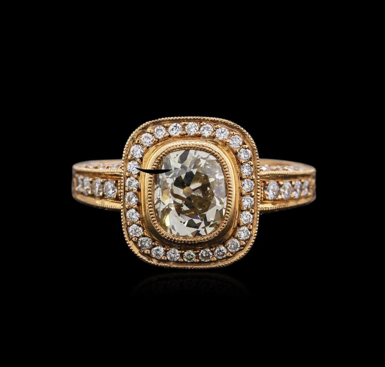 One electronically tested 14-18KT rose gold ladies cast diamond engagement ring with a bright polish finish. Identified with markings of "18K". Condition is new. Containing: One bezel set old mine cut diamond, measuring 7.80 - 6.50 x 4.43mm (depth est.) approximate weight of 1.38ct. Clarity: SI-1. Color: K. Fifty prong set round brilliant cut diamonds, measuring 1.50 - 1.20 x 0.81mm (depth est.) approximate total weight of 50 Stones = 0.45ct. Clarity: SI-1 to SI-2. Color: F, Cut is Good. Diamonds are graded in the mounting, unless otherwise stated. Total Weight of Diamonds 1.83ct. Total Weight of Engagement Ring 7.20 grams. GGL Appraised.