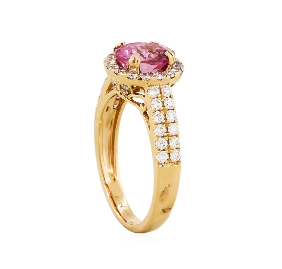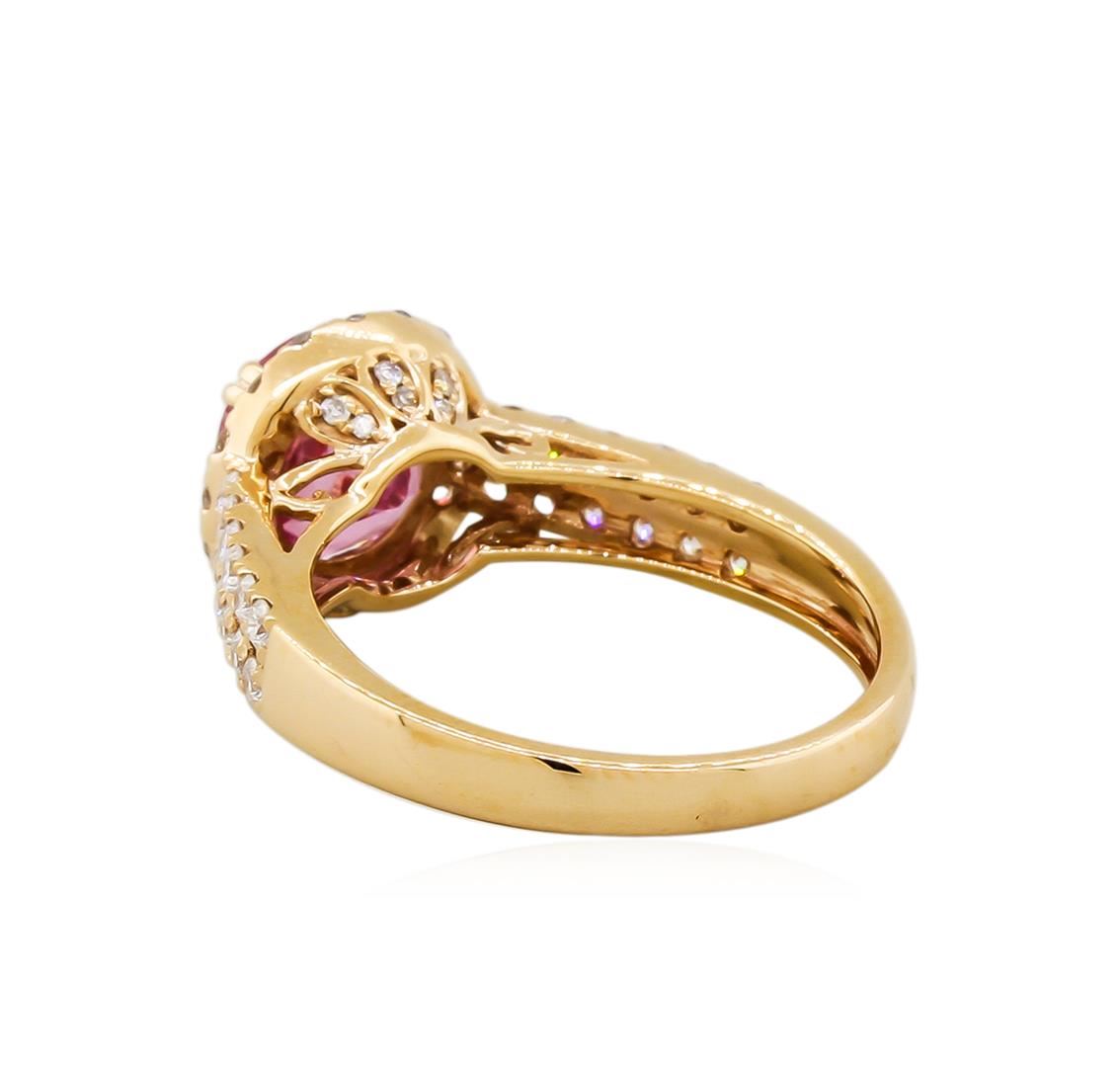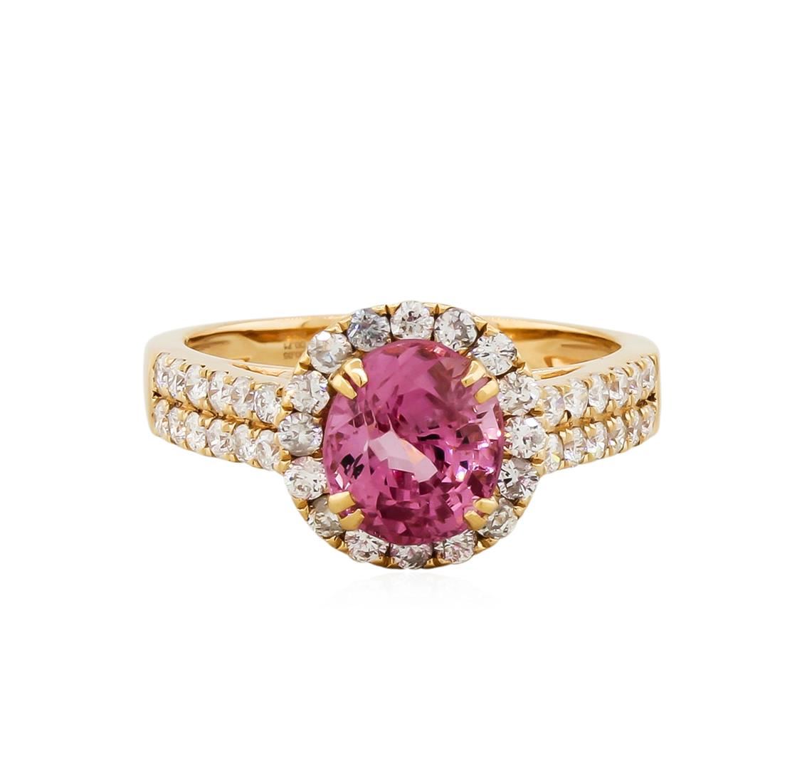 Classic and beautiful spinel and diamond ring set in 4.35 grams of 18KT rose gold featuring a 2.29 carat spinel center stone surrounded by fifty-two round diamonds which extend down each side of the band totaling 0.76 carats.