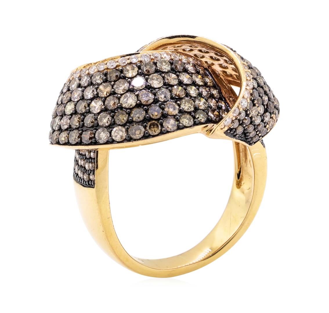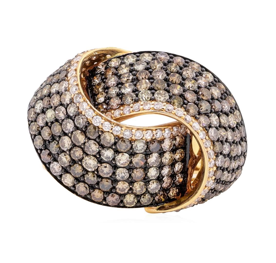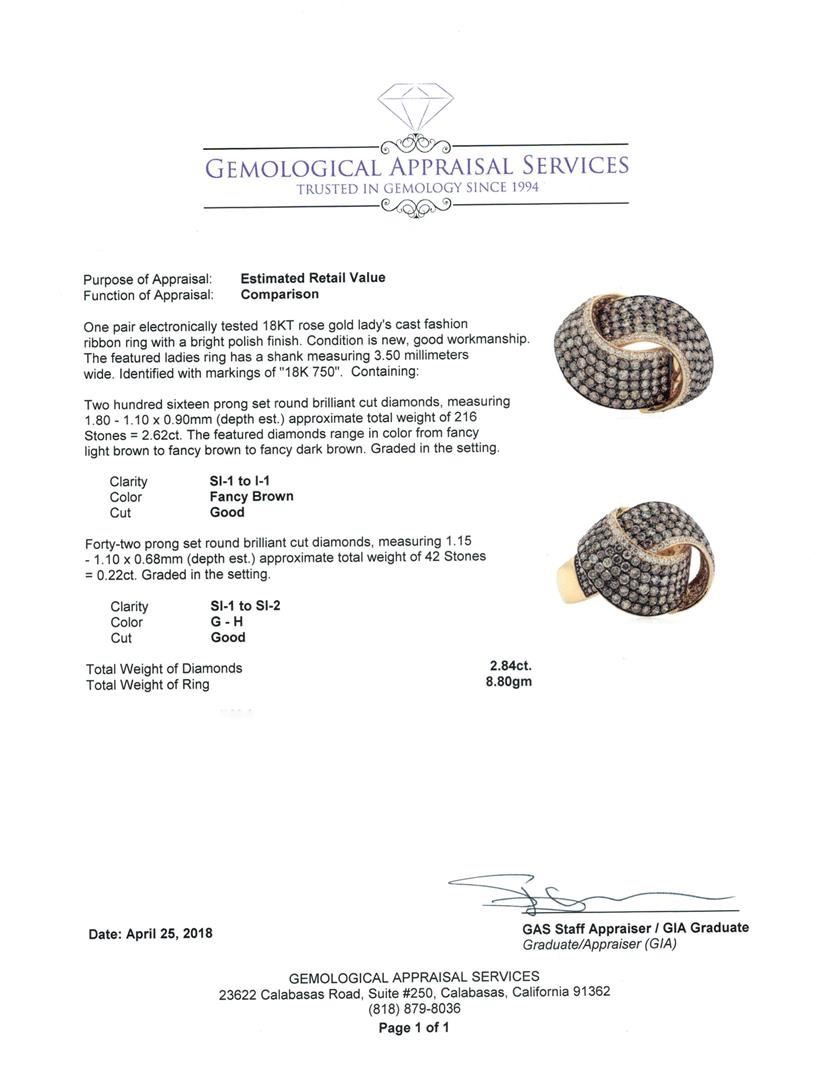 One pair electronically tested 18KT rose gold Ladies cast fashion ribbon ring with a bright polish finish. The featured ladies ring has a shank measuring 3.50 millimeters wide. Identified with markings of '18K 750'. Condition is new, good workmanship. Containing: Two Hundred Sixteen prong set round brilliant cut diamonds, measuring 1.80 - 1.10 x 0.90mm (depth est.) approximate total weight of 216 Stones = 2.62ct. The featured diamonds range in color from fancy light brown to fancy brown to fancy dark brown. Graded in the setting. Color Fancy Brown Clarity SI-1 to I-1 Cut Good Forty-Two prong set round brilliant cut diamonds, measuring 1.15 - 1.10 x 0.68mm (depth est.) approximate total weight of 42 Stones = 0.22ct. Graded in the setting. Color G - H Clarity SI-1 to SI-2 Cut Good. Total Weight of Diamonds 2.84ct.. Total Weight of Ring 8.80gm. GAS Appraised.