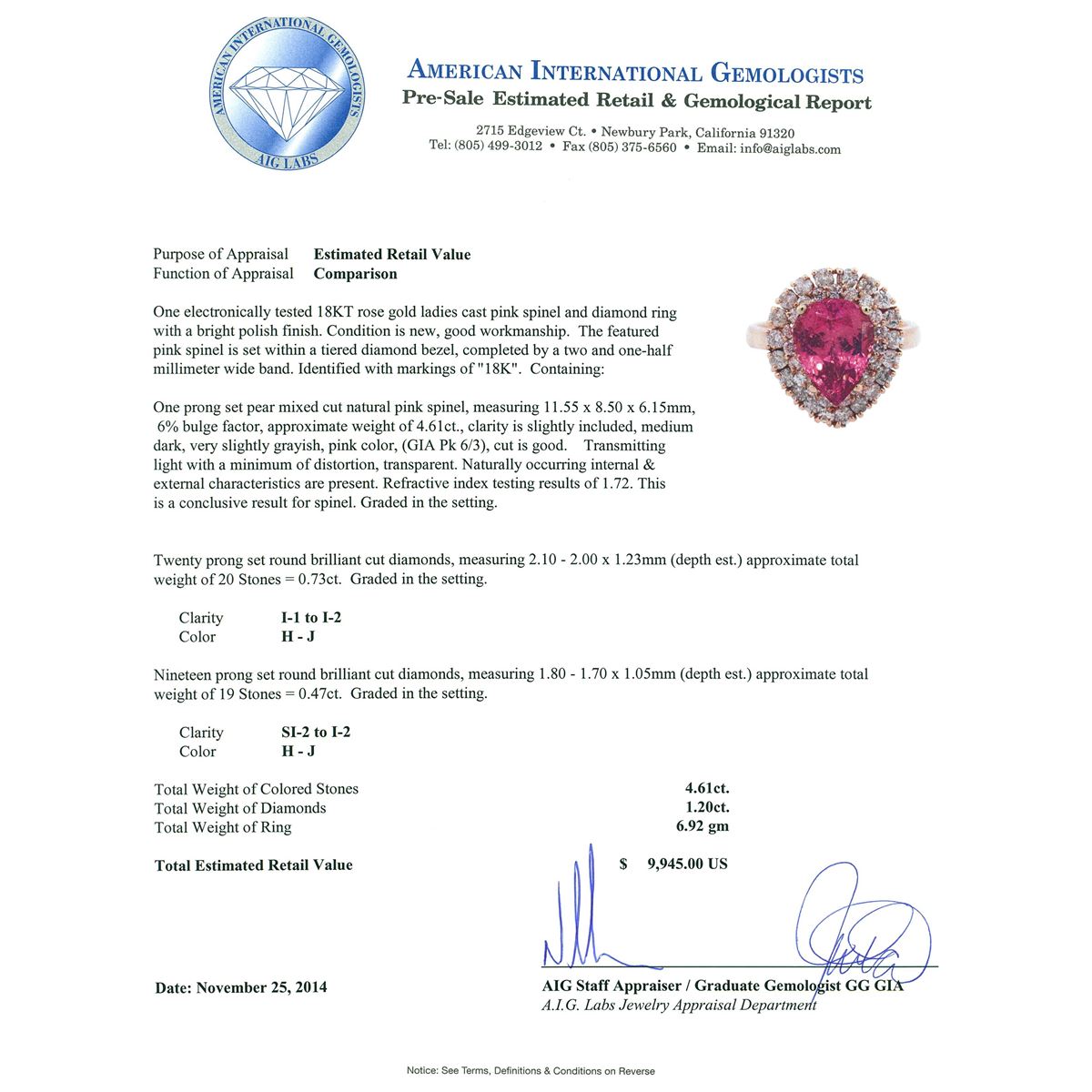One electronically tested 18KT rose gold ladies cast pink spinel and diamond ring with a bright polish finish. The featured pink spinel is set within a tiered diamond bezel, completed by a two and one-half millimeter wide band. Identified with markings of "18K". Condition is new, good workmanship. Containing: One prong set pear mixed cut natural pink spinel, measuring 11.55 x 8.50 x 6.15mm, 6%. bulge factor, approximate weight of 4.61ct., clarity is slightly included, medium dark, very slightly grayish, pink color, (GIA Pk 6/3), cut is good. Transmitting light with a minimum of distortion, transparent. Naturally occurring internal & external characteristics are present. Refractive index testing results of 1.72. This is a conclusive result for spinel. Graded in the setting. Twenty prong set round brilliant cut diamonds, measuring 2.10 - 2.00 x 1.23mm (depth est.) approximate total weight of 20 Stones = 0.73ct. Graded in the setting. Clarity: I-1 to I-2. Color: H - J Nineteen prong set round brilliant cut diamonds, measuring 1.80 - 1.70 x 1.05mm (depth est.) approximate total weight of 19 Stones = 0.47ct. Graded in the setting. Clarity: SI-2 to I-2. Color: H - J. Total Weight of Colored Stones 4.61ct. Total Weight of Diamonds 1.20ct. Total Weight of Ring 6.92 grams. AIG Appraised at $9,945.00.