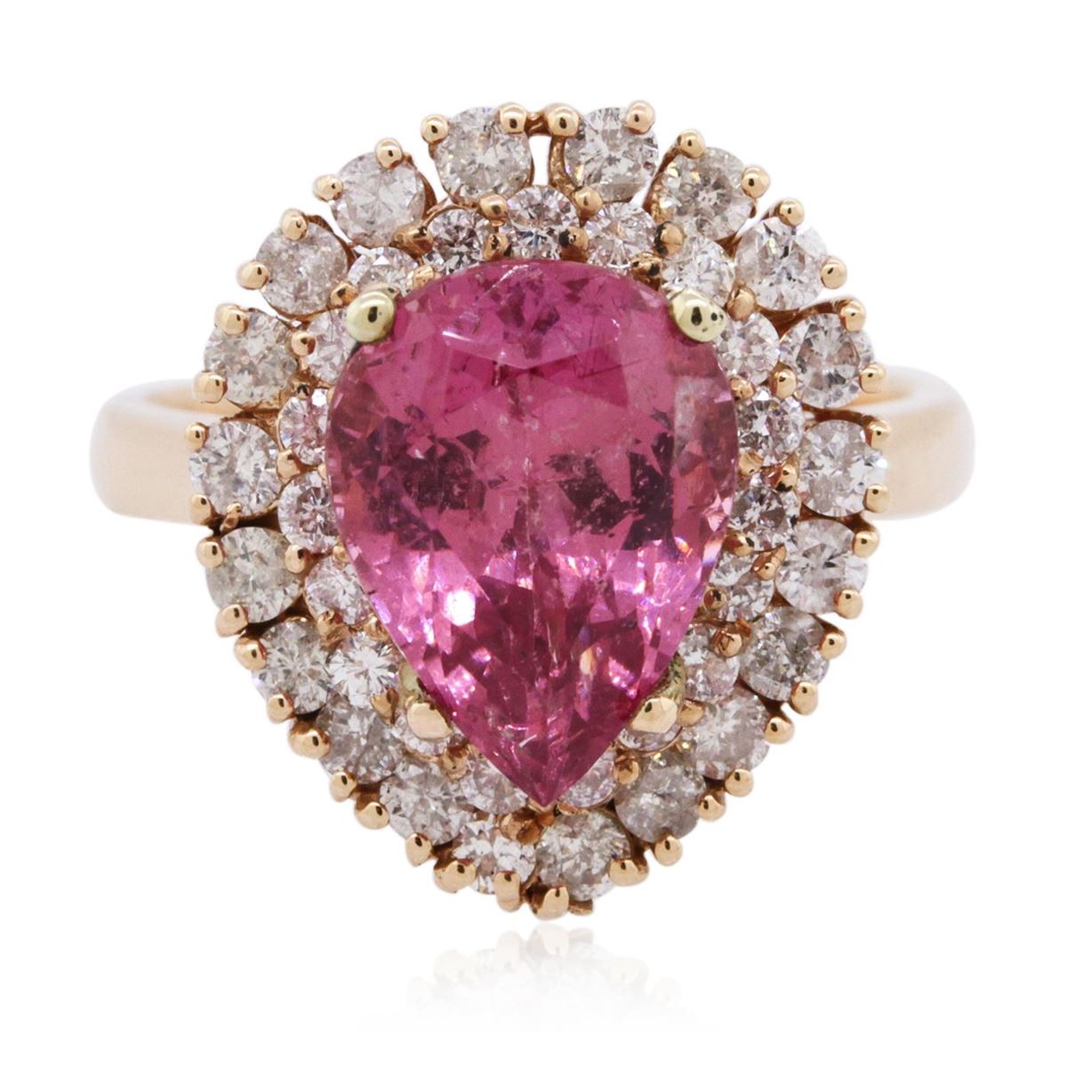 One electronically tested 18KT rose gold ladies cast pink spinel and diamond ring with a bright polish finish. The featured pink spinel is set within a tiered diamond bezel, completed by a two and one-half millimeter wide band. Identified with markings of "18K". Condition is new, good workmanship. Containing: One prong set pear mixed cut natural pink spinel, measuring 11.55 x 8.50 x 6.15mm, 6%. bulge factor, approximate weight of 4.61ct., clarity is slightly included, medium dark, very slightly grayish, pink color, (GIA Pk 6/3), cut is good. Transmitting light with a minimum of distortion, transparent. Naturally occurring internal & external characteristics are present. Refractive index testing results of 1.72. This is a conclusive result for spinel. Graded in the setting. Twenty prong set round brilliant cut diamonds, measuring 2.10 - 2.00 x 1.23mm (depth est.) approximate total weight of 20 Stones = 0.73ct. Graded in the setting. Clarity: I-1 to I-2. Color: H - J Nineteen prong set round brilliant cut diamonds, measuring 1.80 - 1.70 x 1.05mm (depth est.) approximate total weight of 19 Stones = 0.47ct. Graded in the setting. Clarity: SI-2 to I-2. Color: H - J. Total Weight of Colored Stones 4.61ct. Total Weight of Diamonds 1.20ct. Total Weight of Ring 6.92 grams. AIG Appraised at $9,945.00.