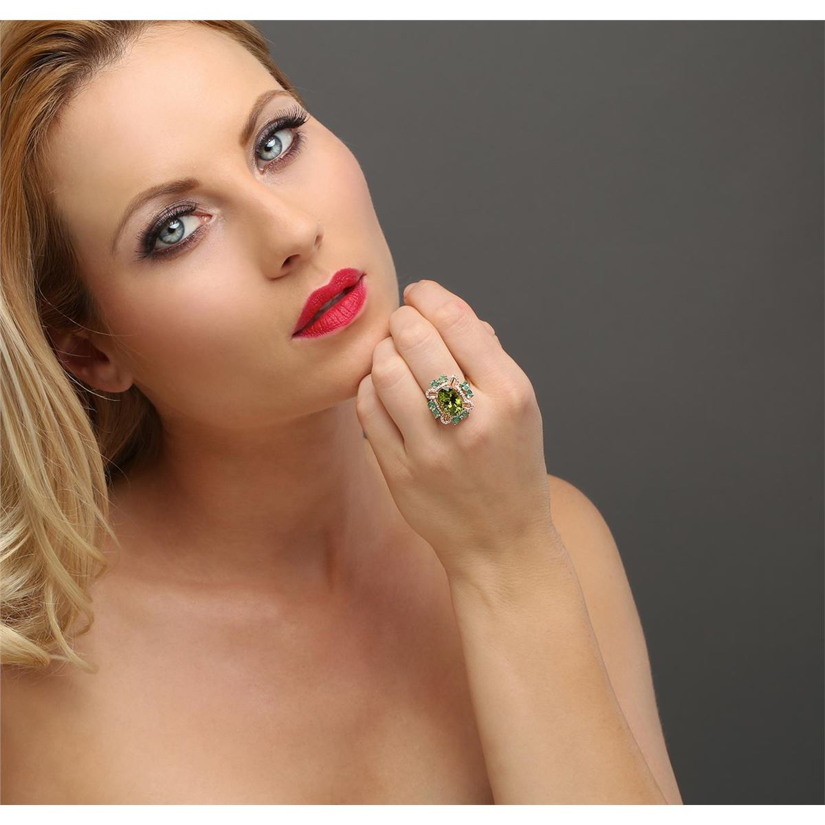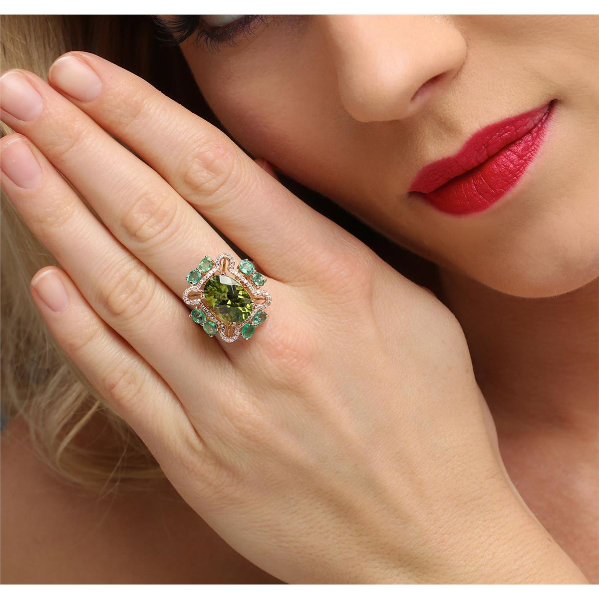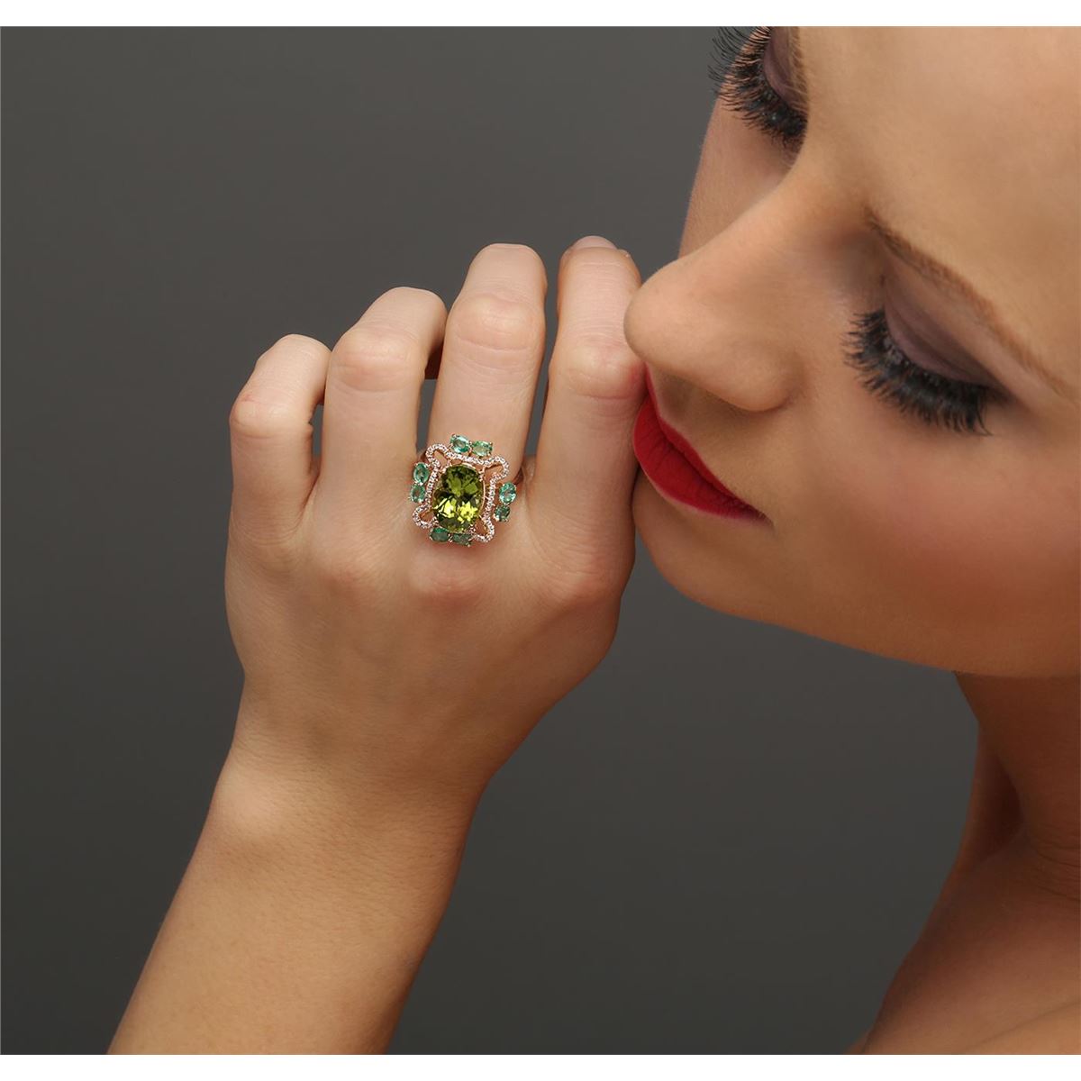 One ring featuring: 18KT rose gold weighing 5.70 grams containing one peridot center stone with a total weight of 7.40ct, eight emeralds with a total weight of 1.37ct, and round diamonds with a total weight of 0.30ct.