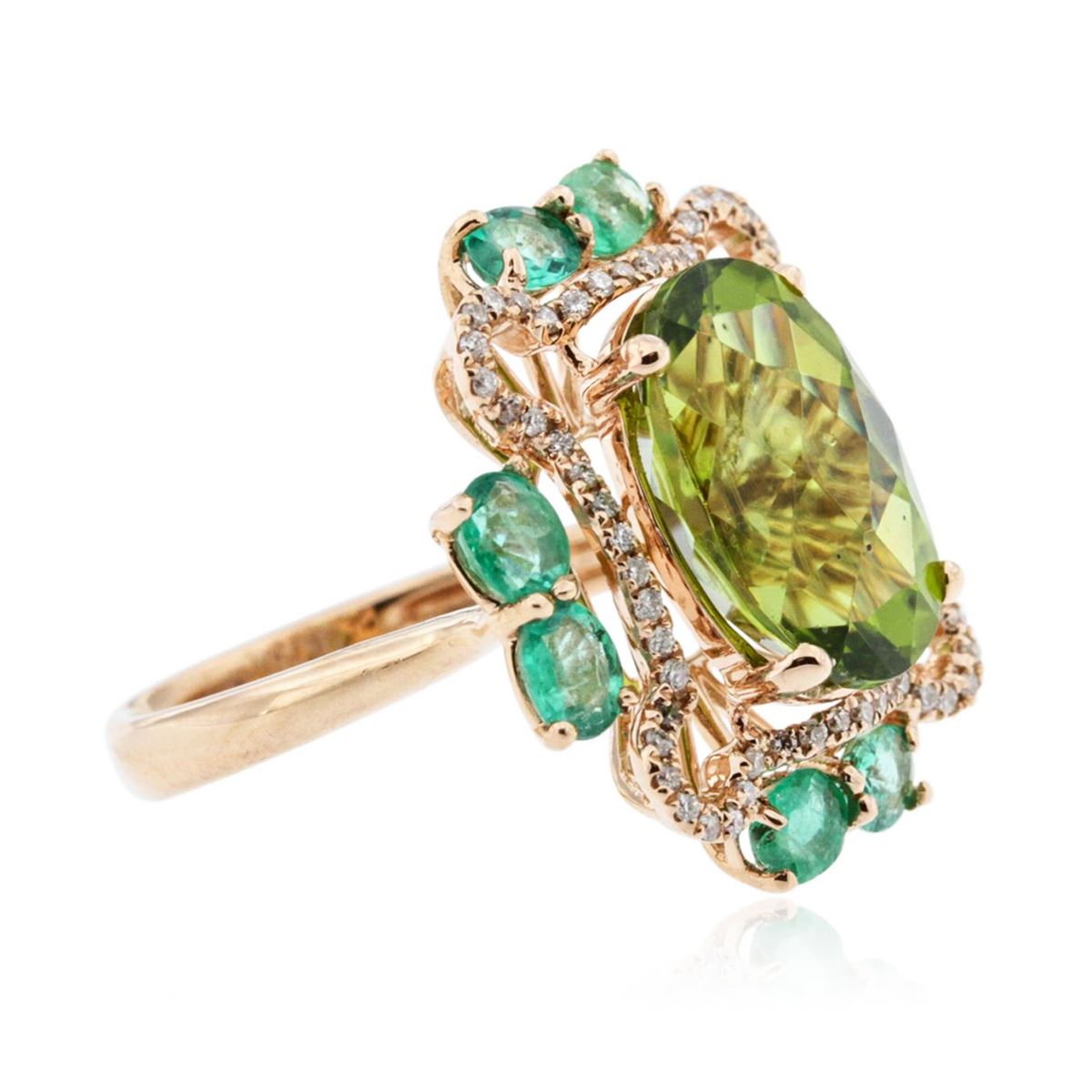 One ring featuring: 18KT rose gold weighing 5.70 grams containing one peridot center stone with a total weight of 7.40ct, eight emeralds with a total weight of 1.37ct, and round diamonds with a total weight of 0.30ct.