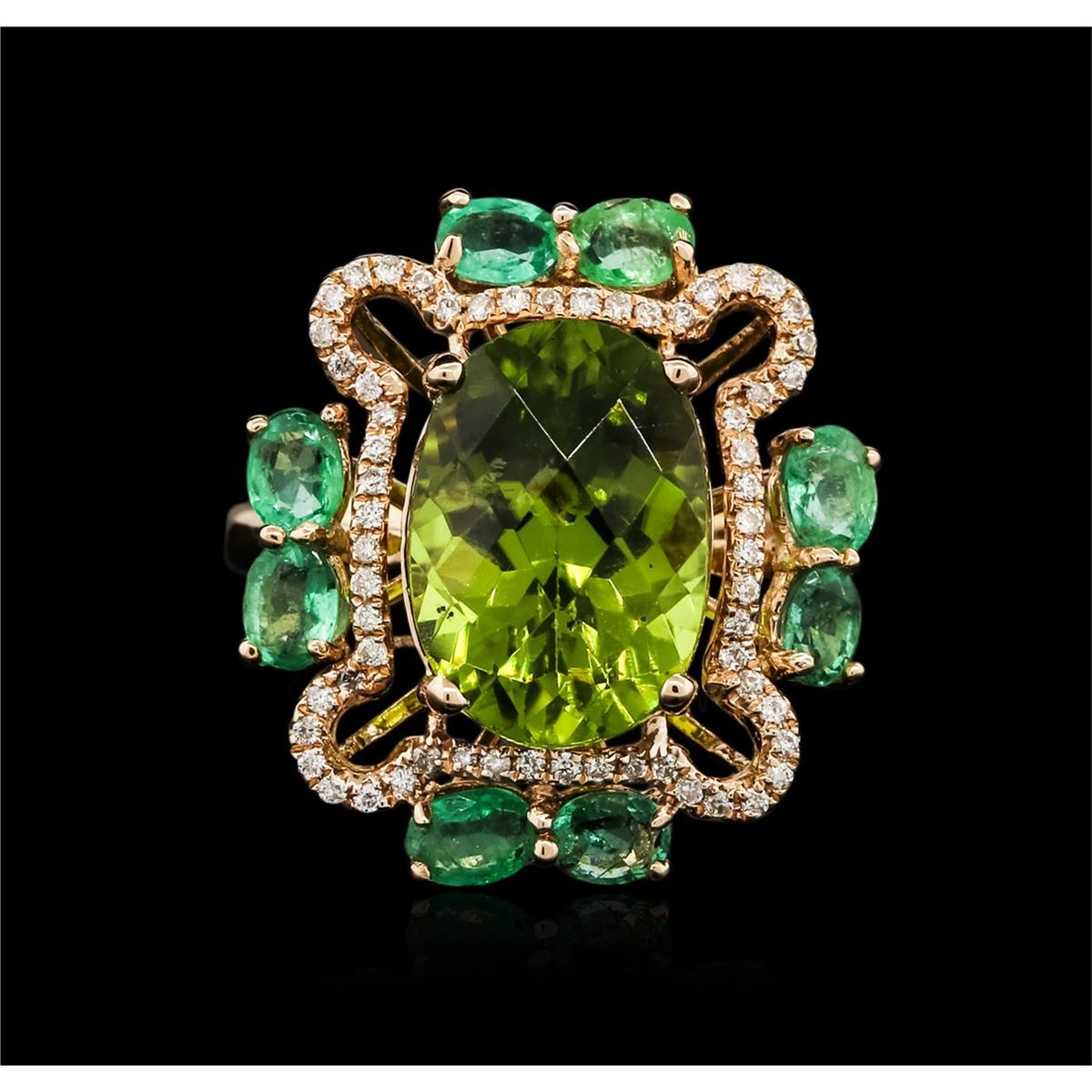 One ring featuring: 18KT rose gold weighing 5.70 grams containing one peridot center stone with a total weight of 7.40ct, eight emeralds with a total weight of 1.37ct, and round diamonds with a total weight of 0.30ct.