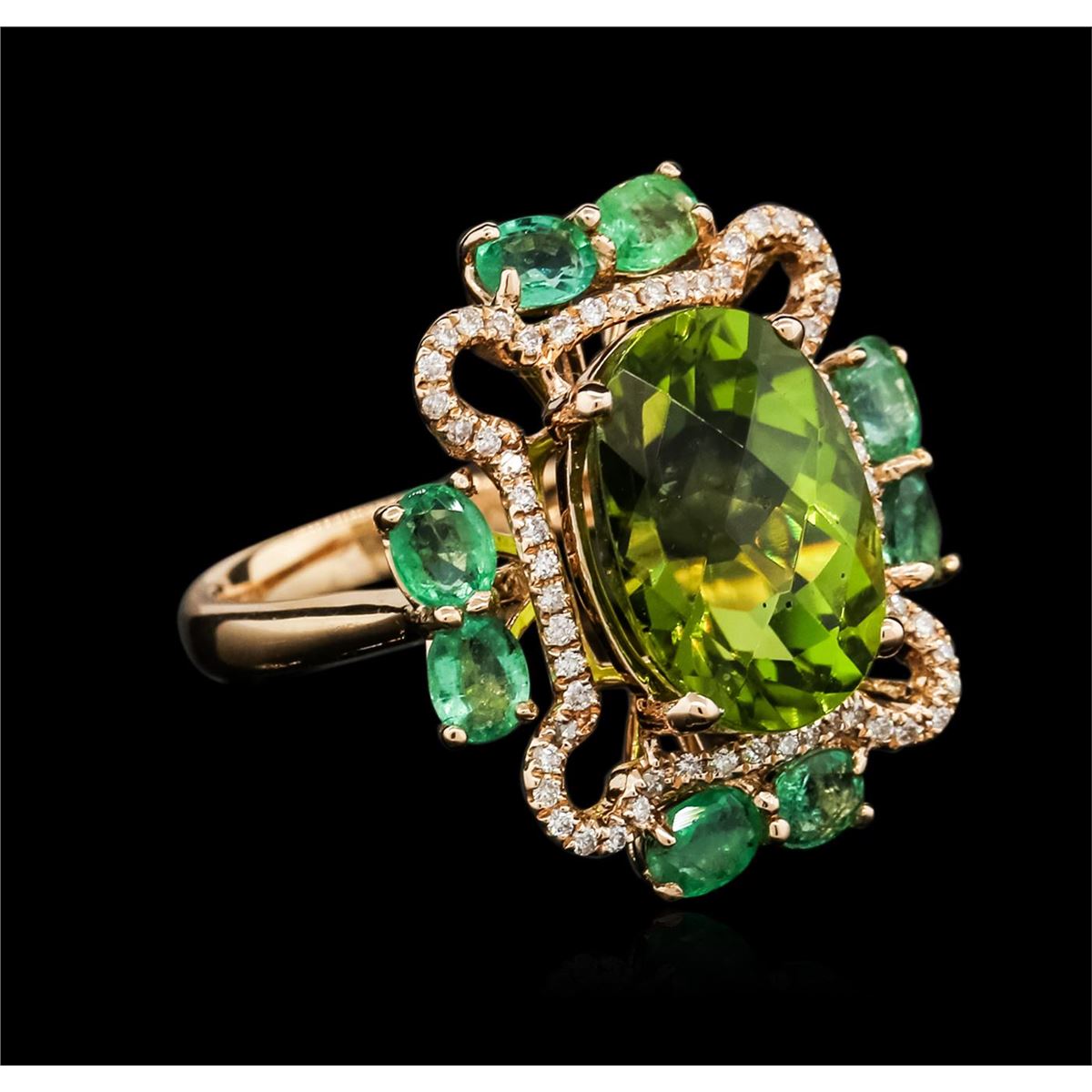 One ring featuring: 18KT rose gold weighing 5.70 grams containing one peridot center stone with a total weight of 7.40ct, eight emeralds with a total weight of 1.37ct, and round diamonds with a total weight of 0.30ct.