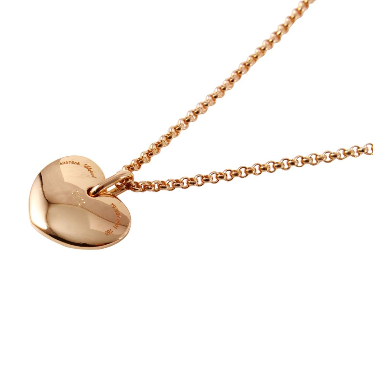 One stamped & tested 18KT rose gold ladies Chopard Heart pendant & chain 16.0" long, with a lobster claw clasp. Identified with markings of "Chopard 750".Model: 797937-5001 Serial Number: 6267865. Note: Retail on this is $3,400.00. Generously sized yet classically proportioned, distinctive yet refined, Chopardissimo is everyday jewellery at its finest. Enhanced by the beautiful calligraphy of the Chopard logo engraved into the gold, this pendant in 18-carat rose gold is as contemporary as it is timeless and beautifully crafted down to the smallest detail. Condition is very good. Total Weight of Pendant & Chain 7.78gm. The descriptions listed should not be construed as an appraisal. The detail is provided as a guideline for color, clarity, weights and measurements to the best of our ability. We welcome inspections. WE SHIP WORLDWIDE!