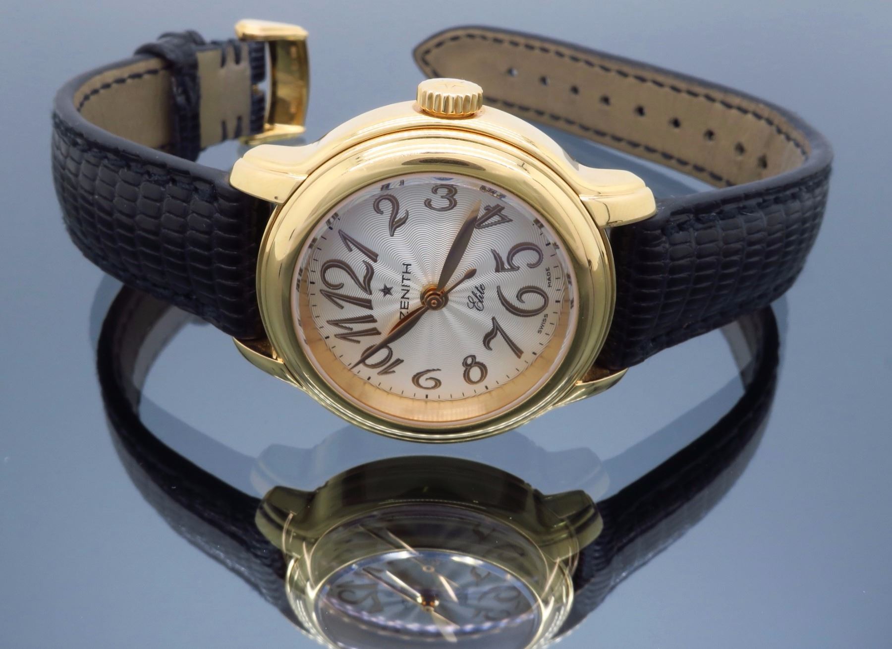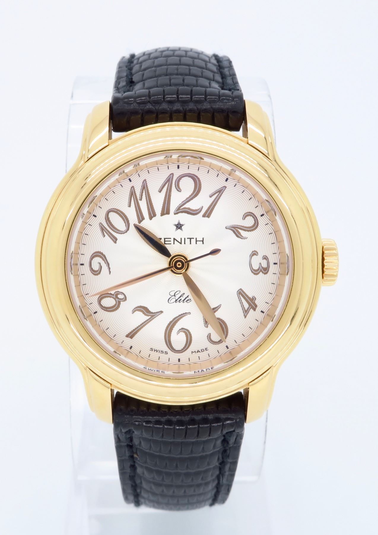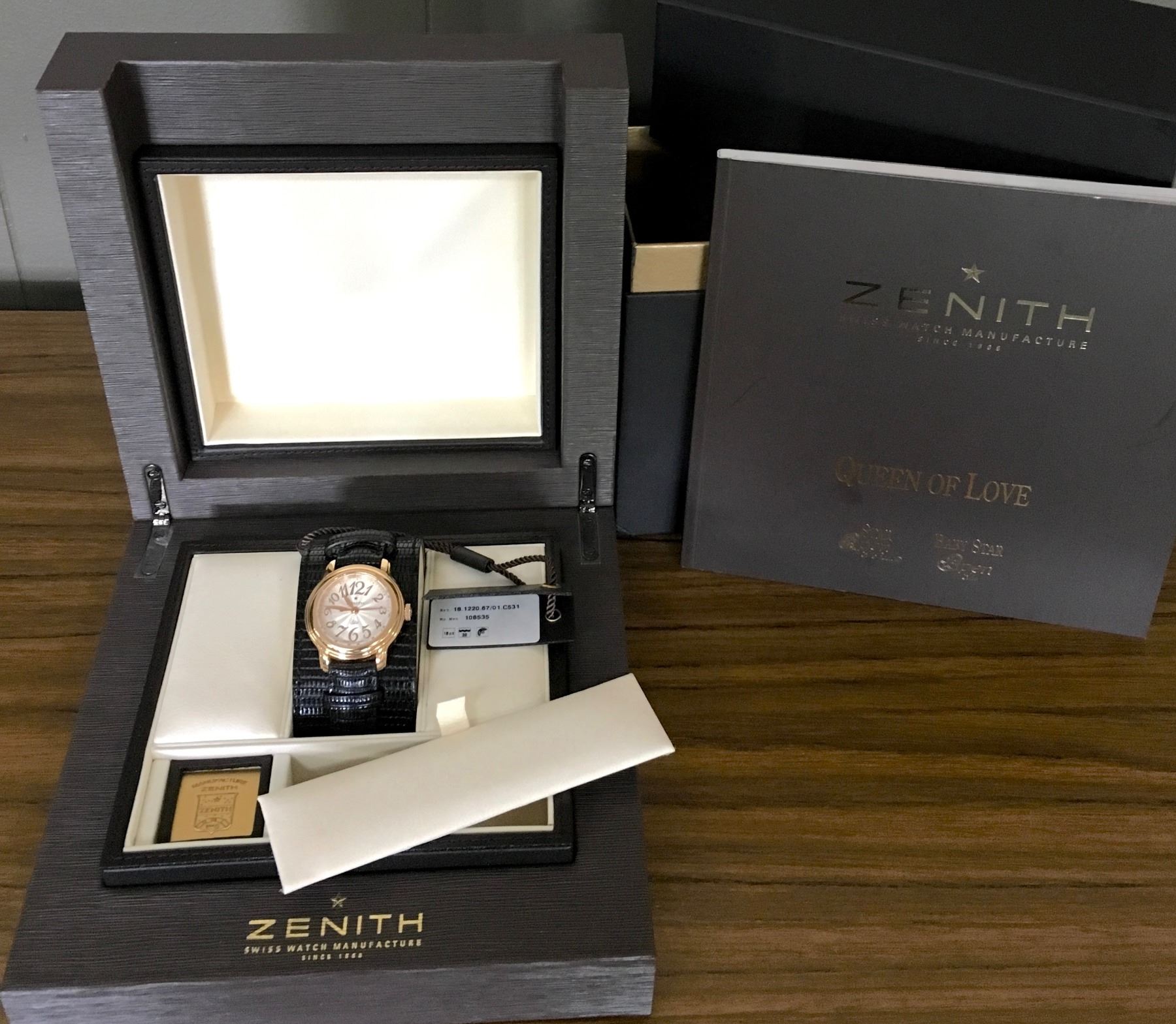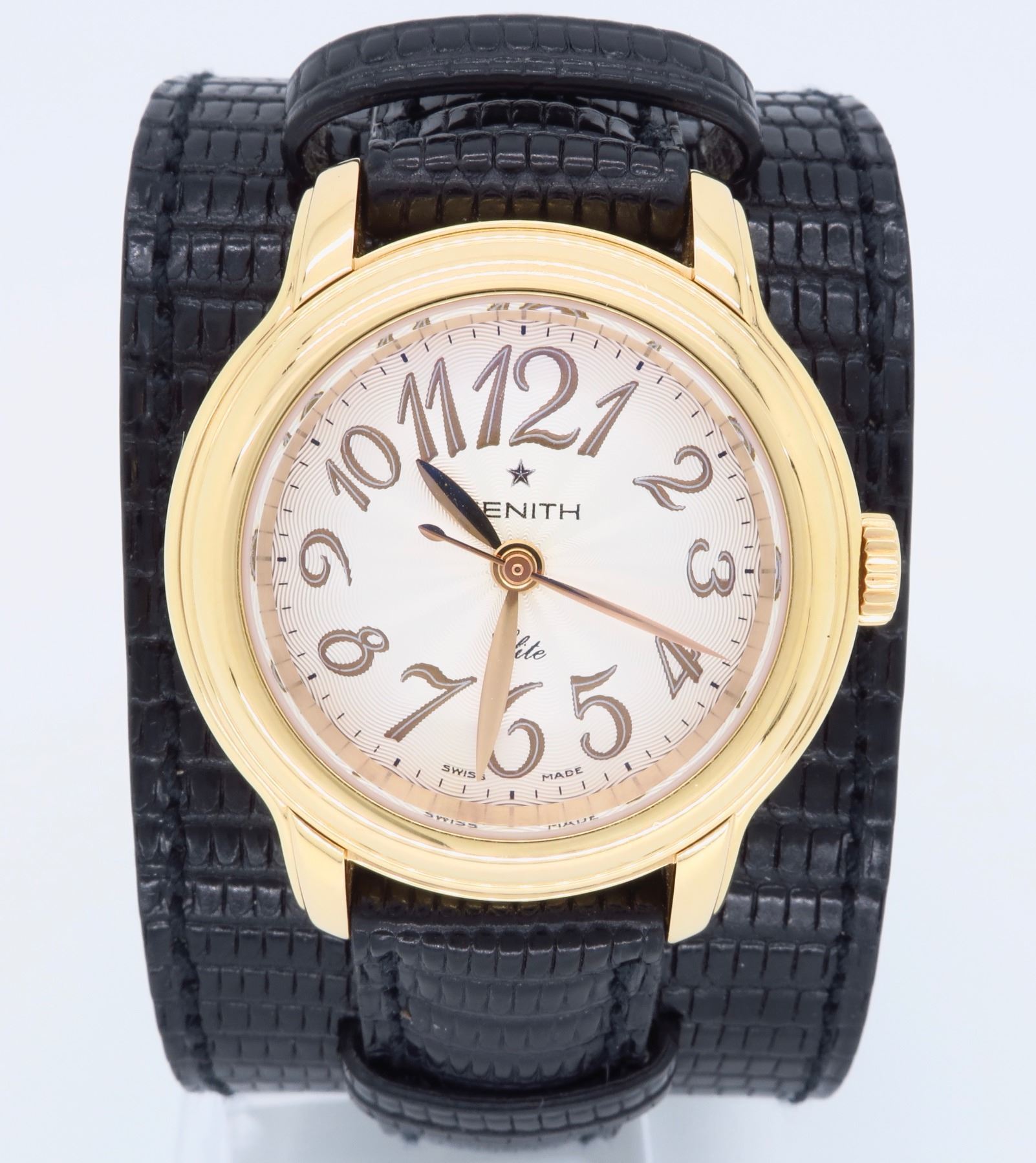 This beautiful Zenith ladies watch is Zenith’s Baby Star Elite Model. The 18K Rose Gold watch features a silver guilloche dial with large Arabic numeral hour markers, stunning 18K Rose gold hands and scratch resistant sapphire case back with engraved Zenith stars. The black lizard strap has a removable cuff lined with silky Alzavel calfskin. The power reserve on this automatic watch is about 50 hours. The case dimensions of this watch are 32mm; this watch is rated 30m for water resistance. The model number on this watch is: 1812206701c531.