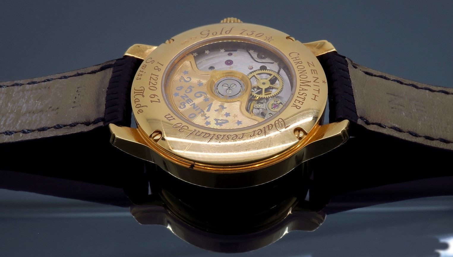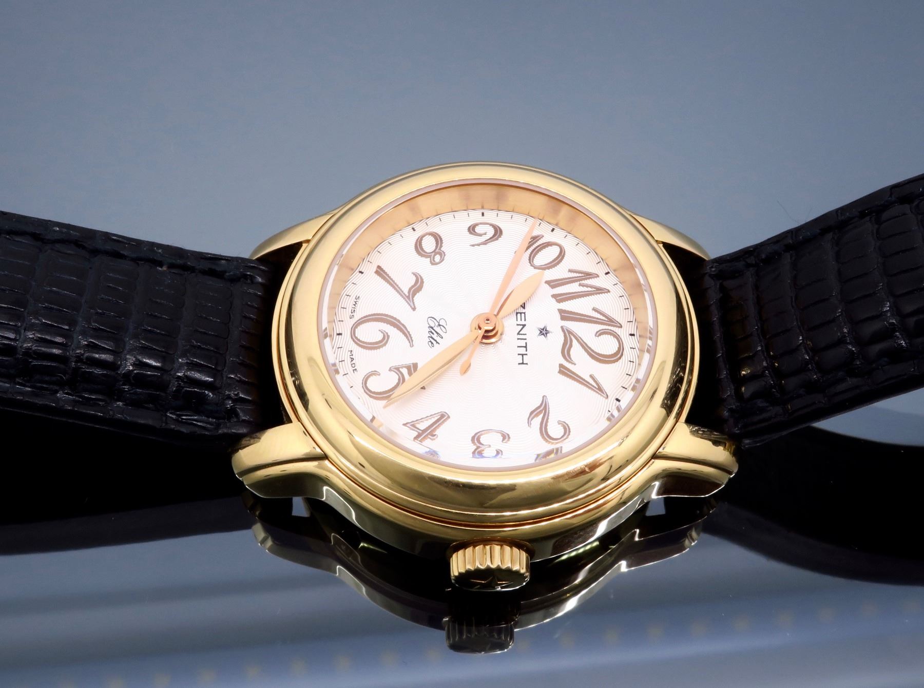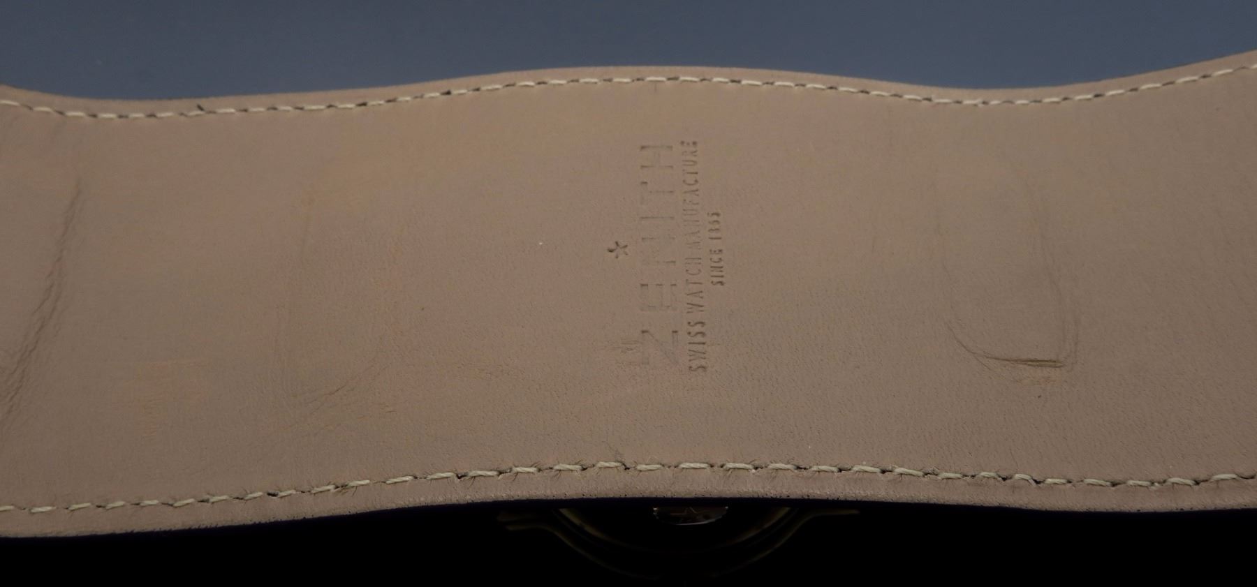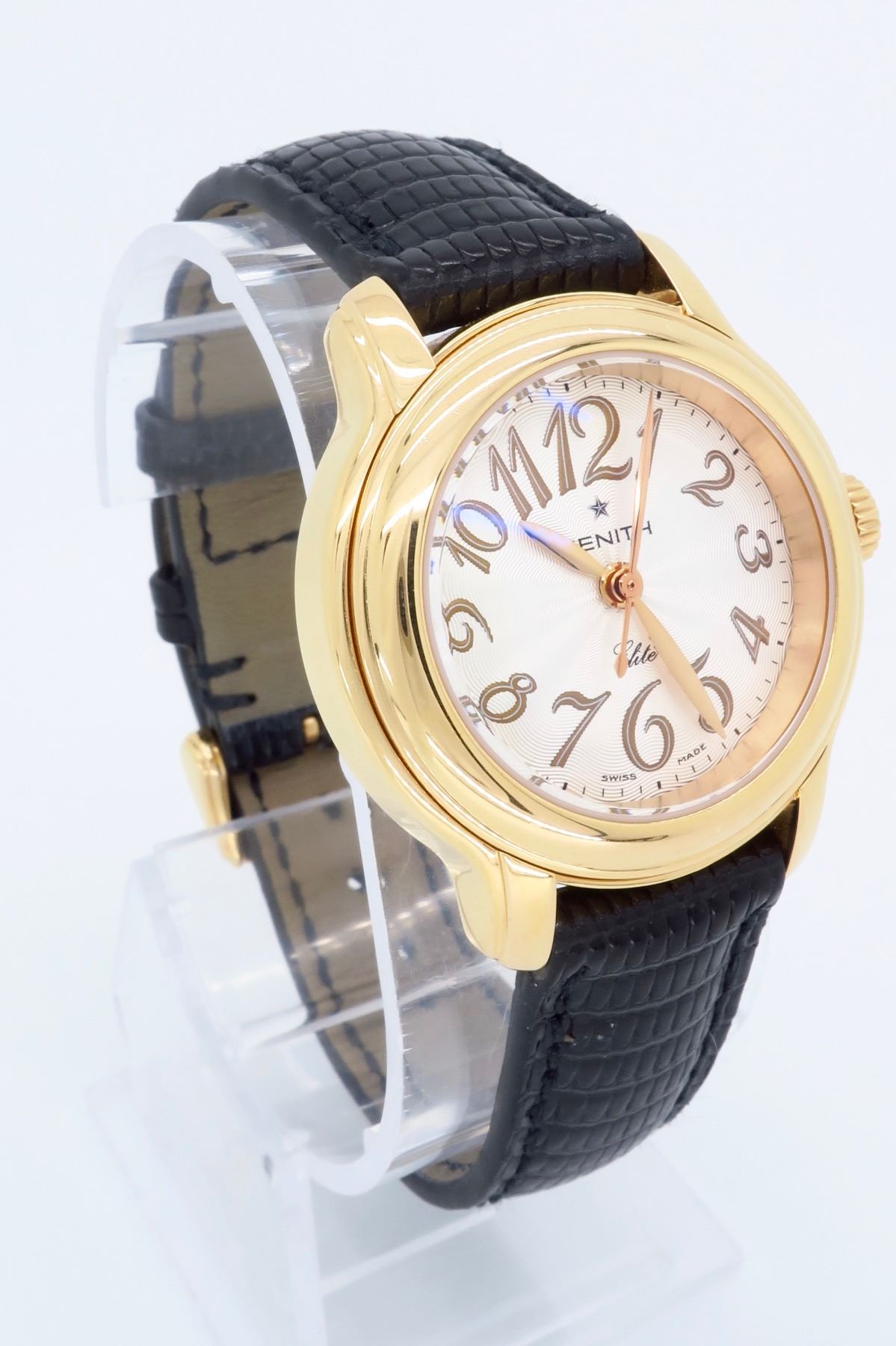 This beautiful Zenith ladies watch is Zenith’s Baby Star Elite Model. The 18K Rose Gold watch features a silver guilloche dial with large Arabic numeral hour markers, stunning 18K Rose gold hands and scratch resistant sapphire case back with engraved Zenith stars. The black lizard strap has a removable cuff lined with silky Alzavel calfskin. The power reserve on this automatic watch is about 50 hours. The case dimensions of this watch are 32mm; this watch is rated 30m for water resistance. The model number on this watch is: 1812206701c531.