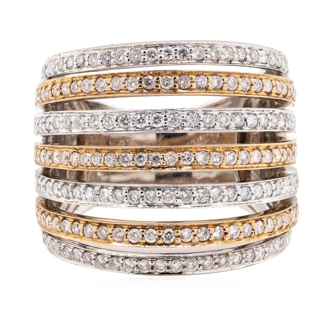 One electronically tested 18KT rose and white gold Ladies cast seven row straight line ring with a tapered shank with a bright polish finish. The featured ladies ring has a shank measuring 6.50 millimeters wide. Identified with markings of '18K'. Condition is new, good workmanship. Containing: One Hundred Seventy-Nine prong set round brilliant cut diamonds, measuring 1.30 - 1.20 x 0.75mm (depth est.) approximate total weight of 179 Stones = 1.23ct. Graded in the setting. Color H - I Clarity SI-1 to SI-2 Cut Good. Total Weight of Diamonds 1.23ct.. Total Weight of Ring 10.50gm. GAS Appraised.