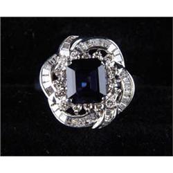 Lot 129 18KT SAPPHIRE AND DIAMOND RING Beautiful 18kt. white gold ring has center emerald-cut blue sapphire, 2.58ct., surrounded by single cut and baguette diamonds. Total diamond approximately .82ct. CONDITION: Very good to excellent. 5-70908