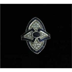Lot 57 18KT SAPPHIRE & DIAMOND RING. Beautiful Art Deco style ring is 18kt white gold set with a center oval blue sapphire approx. .33ct (VS1). The ring design is outlined with sixty-four rectangular cut blue sapphire melees with a total weight of approx. 1.0ct (VS1). The entire background of the ring is set with twenty-two pave set diamond melees with a total weight of approx. .25ct. Ring is stamped “18k”. CONDITION: Very good to excellent. 5-69436 (700-1,000)