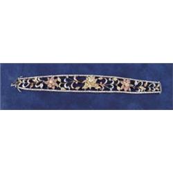 Lot 107 18KT TWO-TONED BRACELET 18kt. gold bracelet features and outline of white gold box links set with diamonds which frame and open work design and flowers and leaves in yellow and pink gold. The flowers and leaves are all encrusted with sparkling diamonds. Total diamond weight is 5.43ct. Size is 7 1/2” l. CONDITION: Very good to excellent. 5-70906