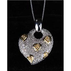 Lot 149 18KT TWO-TONED GOLD AND DIAMOND PENDANT Unusual pendant features 18kt. white gold free-form heart. The front of the heart is covered in pavee-set diamonds with small yellow gold hearts scattered about. The back of the heart is open work filigree. Total diamond weight is 1.73ct. Pendant is suspended on 16” chain. Pendant is 1 1/2” long. CONDITION: Very good to excellent. 5-70896