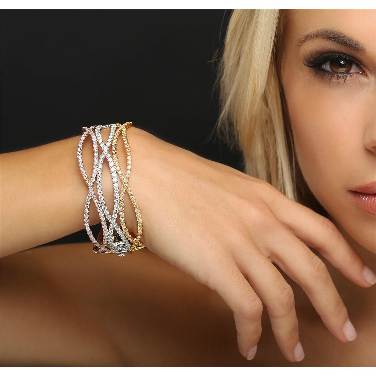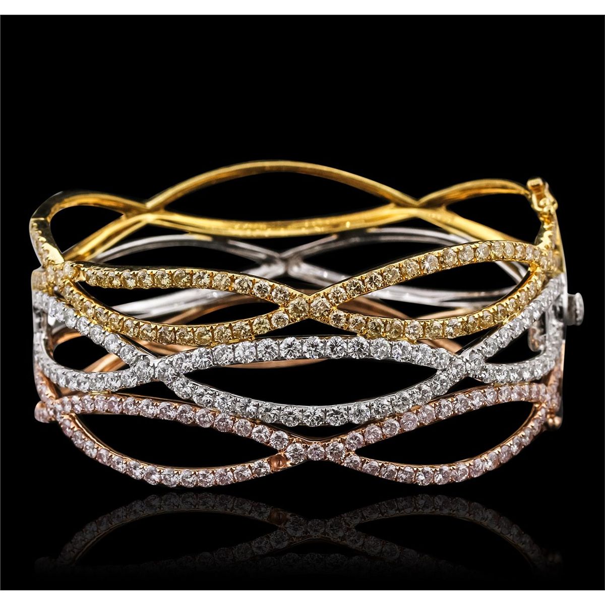 One electronically tested 18KT white, yellow and rose gold ladies cast & assembled diamond bangle bracelet with a bright polish finish. Seven and one-quarter inch wearable length bangle bracelet features intertwining diamond ribbons supported by hinged shoulders, terminating in a concealed clasp with twin safeties. Trademark is AKMS. Identified with markings of "18K". Condition is new, good workmanship. Containing: Sixty-Nine prong set round brilliant cut diamonds, measuring 2.70 - 2.60 x 1.59mm (depth est.) approximate. Total Weight of 69 Stones = 4.68ct. Graded in the setting. Clarity: VS-2 to SI-2. Color: G - I Seventy-Six prong set round brilliant cut diamonds, measuring 2.40 - 2.30 x 1.41mm (depth est.) approximate. Total Weight of 76 Stones = 3.46ct. Color grade is an average for the group. Graded in the setting. Clarity: SI-1 to I-1 Seventy-Six prong set round brilliant cut diamonds, measuring 2.50 - 2.30 x 1.44mm (depth est.) approximate. Total Weight of 76 Stones = 4.00ct. Color grade is an average for the group. Graded in the setting. Clarity: SI-1 to I-1. Total Weight of Diamonds 12.14ct. Total Weight of Bangle Bracelet 59.56gm. AIG Appraised at $52,220.00.
