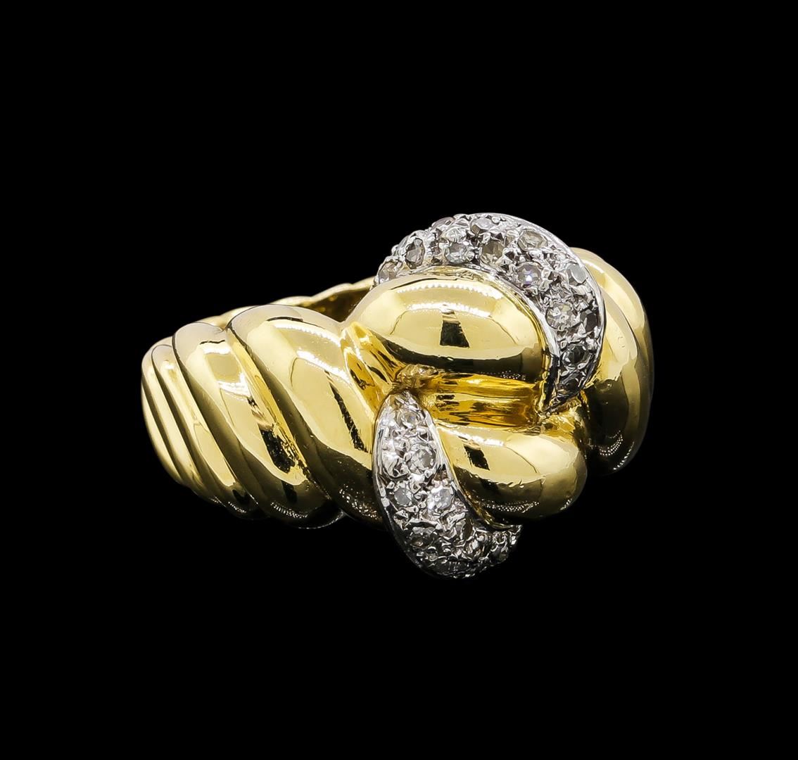 One electronically tested 18KT yellow and white gold ladies cast & assembled diamond ring with a bright polish finish. The ring features numerous yellow gold curvatures supported by two interlocking white gold diamond set curvatures, completed by a patterned three and one-half millimeter wide band. Identified with markings of "750". Condition is good. Containing: Thirty prong set single cut diamonds, measuring 1.50 - 1.40 x 0.87mm (depth est.) approximate total weight of 30 Stones = 0.43ct. Graded in the setting. Clarity: VS-2 to SI-2. Color: I - K. Total Weight of Diamonds 0.43ct. Total Weight of Ring 11.91 grams. AIG Appraised.