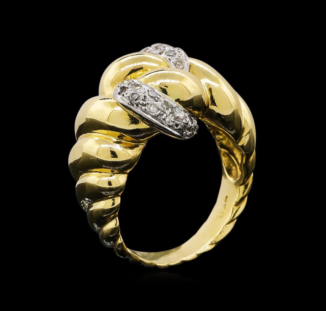 One electronically tested 18KT yellow and white gold ladies cast & assembled diamond ring with a bright polish finish. The ring features numerous yellow gold curvatures supported by two interlocking white gold diamond set curvatures, completed by a patterned three and one-half millimeter wide band. Identified with markings of "750". Condition is good. Containing: Thirty prong set single cut diamonds, measuring 1.50 - 1.40 x 0.87mm (depth est.) approximate total weight of 30 Stones = 0.43ct. Graded in the setting. Clarity: VS-2 to SI-2. Color: I - K. Total Weight of Diamonds 0.43ct. Total Weight of Ring 11.91 grams. AIG Appraised.