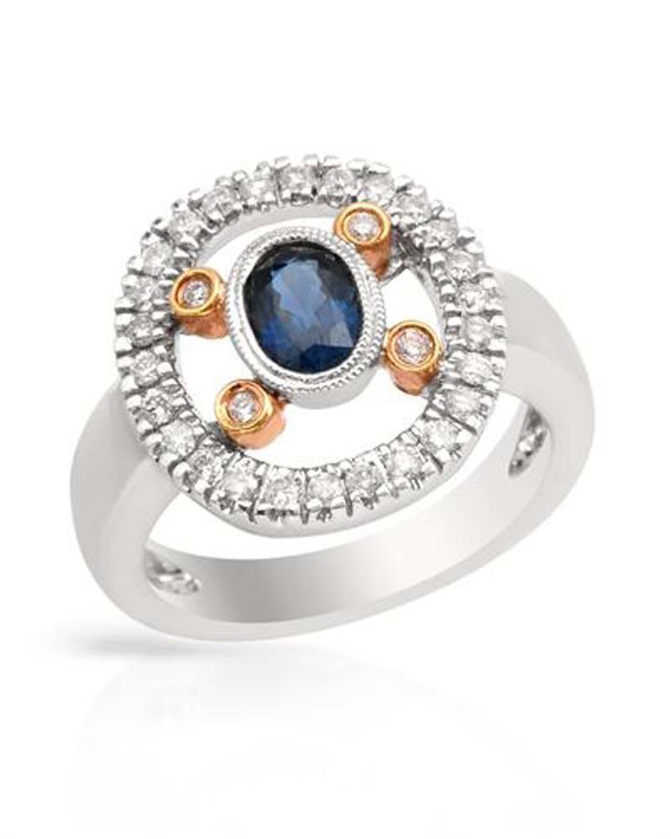 One 18KT Two Tone Gold 0.65ct Blue Sapphire and Diamond Ring. (1) Blue Sapphire with a total weight of 0.65cts. (30) Diamonds with a total weight of 0.37cts. The total weight of this ring is 3.58 grams.