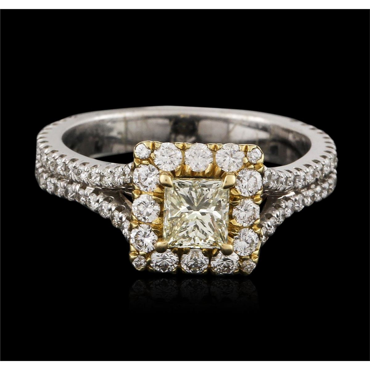 One electronically tested 18KT white and yellow gold ladies cast diamond engagement ring with a bright polish finish. Identified with markings of "18K". Condition is new. Containing: One prong set princess cut diamond, measuring 4.57 x 4.25 x 3.19mm (depth est.) approximate weight of 0.51ct. Clarity: VS-1, Cut is Good. Sixty-Eight prong set round brilliant cut diamonds, measuring 1.10 - 1.10 x 0.66mm (depth est.) approximate total weight of 68 Stones = 0.33ct. Clarity: SI-1 to SI-2. Color: I - J, Cut is Good. All diamonds are graded in the mounting, unless otherwise stated. Total Weight of Diamonds 0.83ct. Total Weight of Engagement Ring 5.20 grams. GGL Appraised at $5,815.00.
