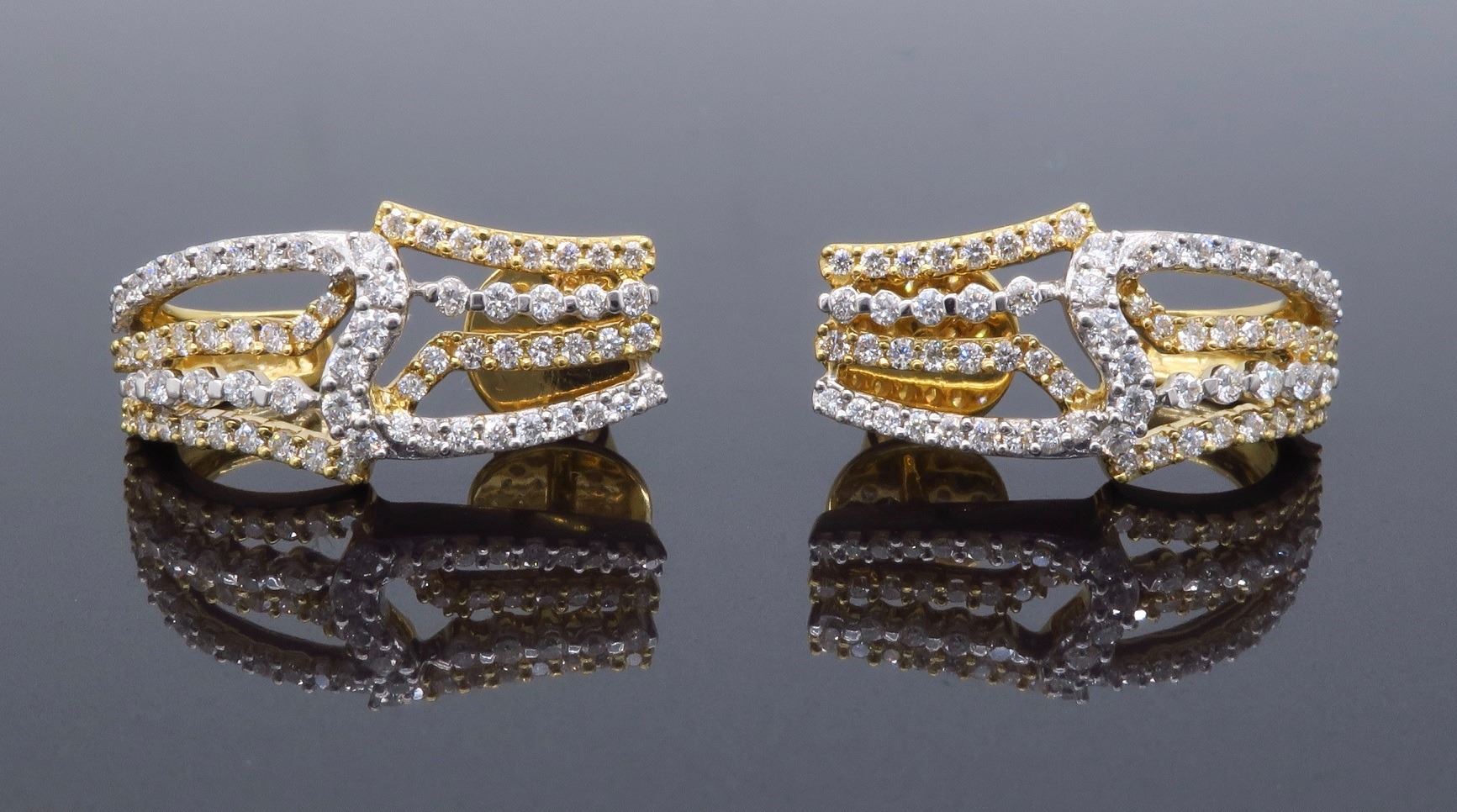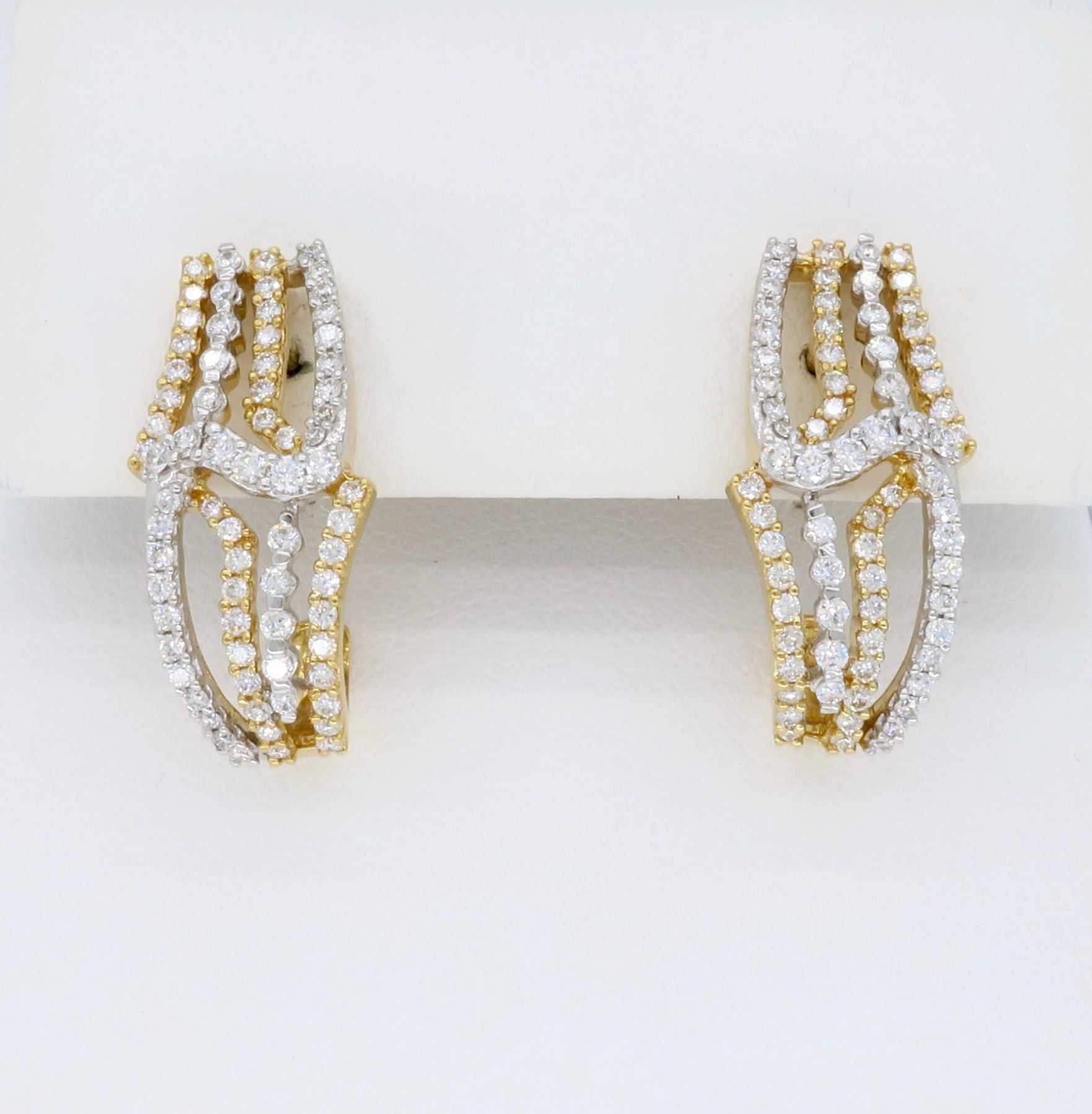 One 18KT Two Tone Gold 0.85ctw Diamond Earrings. Round Diamonds with a total weight of 0.85cts with a color of G-I and clarity of SI-1. Total weight of these earrings are 5.8 grams.