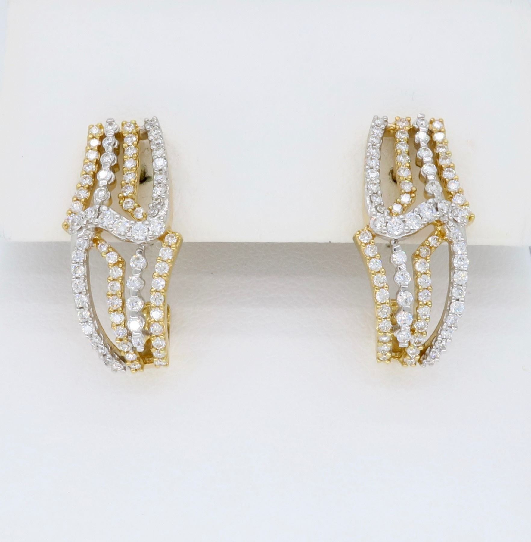 One 18KT Two Tone Gold 0.85ctw Diamond Earrings. Round Diamonds with a total weight of 0.85cts with a color of G-I and clarity of SI-1. Total weight of these earrings are 5.8 grams.