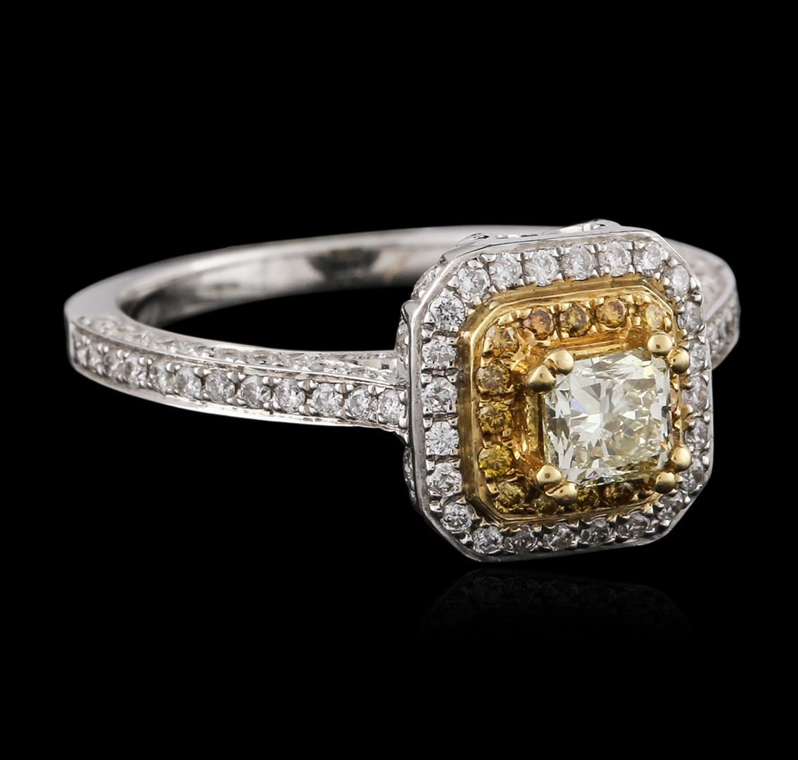 One electronically tested 18KT white and yellow gold ladies cast diamond engagement ring with a bright polish finish. Identified with markings of "18K". Condition is new. Containing: One prong set radiant shaped cut diamond, measuring 4.00. x 3.90 x 2.61mm (depth est.) approximate weight of 0.33ct. Clarity: VS-2, Cut is Good. One Hundred Thirty-Seven prong set round brilliant cut diamonds, measuring 1.00. - 1.00. x 0.60mm (depth est.) approximate total weight of 137 Stones = 0.49ct. Clarity: SI-2 to I-1. Color: I, Cut is Good. Sixteen prong set round brilliant cut diamonds, measuring 1.00. - 1.00. x 0.60mm (depth est.) approximate total weight of 16 Stones = 0.06ct. Clarity: SI-1 to SI-2, Cut is Good. All diamonds are graded in the mounting, unless otherwise stated. Total Weight of Diamonds 0.89ct. Total Weight of Engagement Ring 5.10 grams. GGL Appraised at $4,060.00.