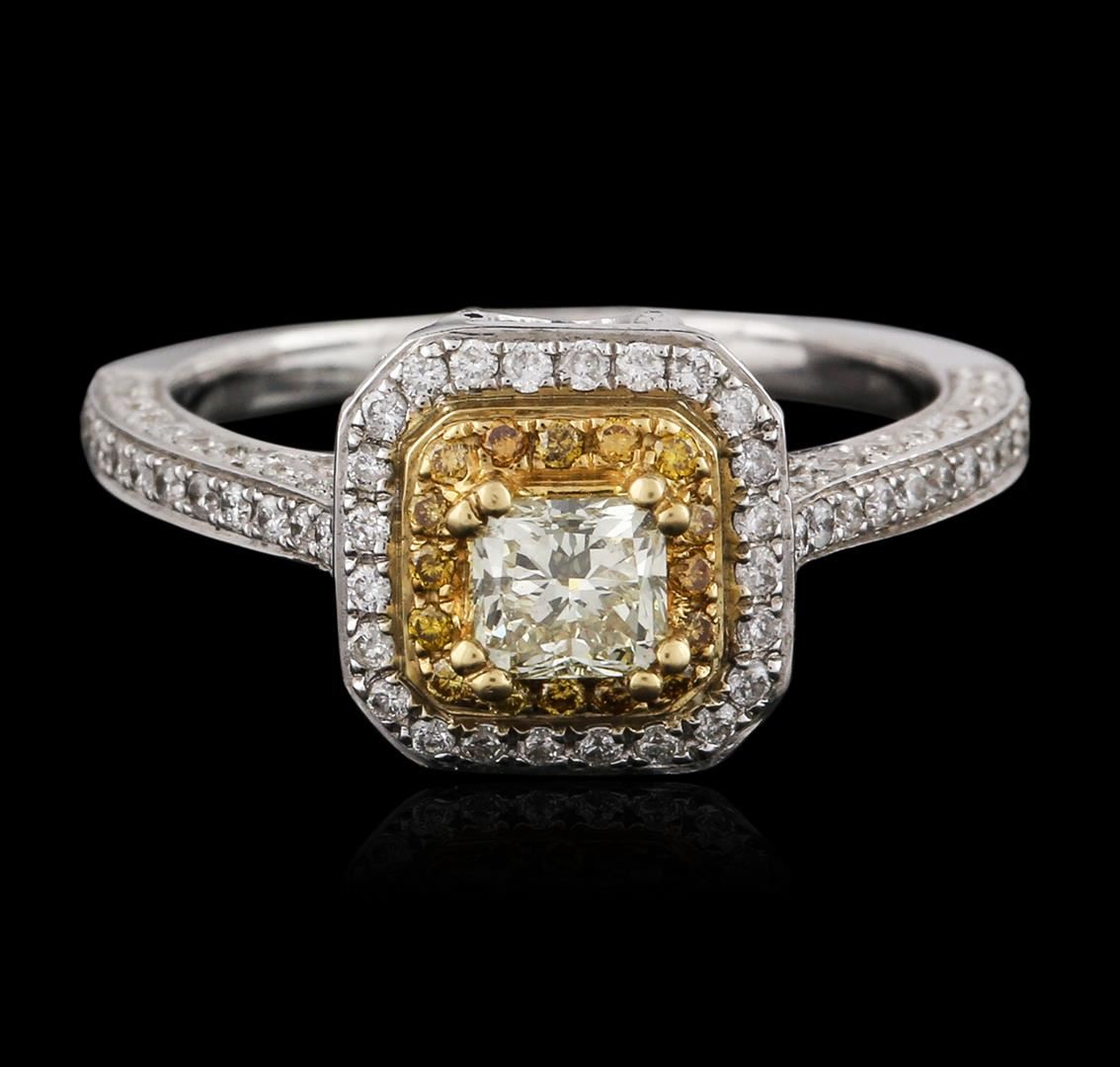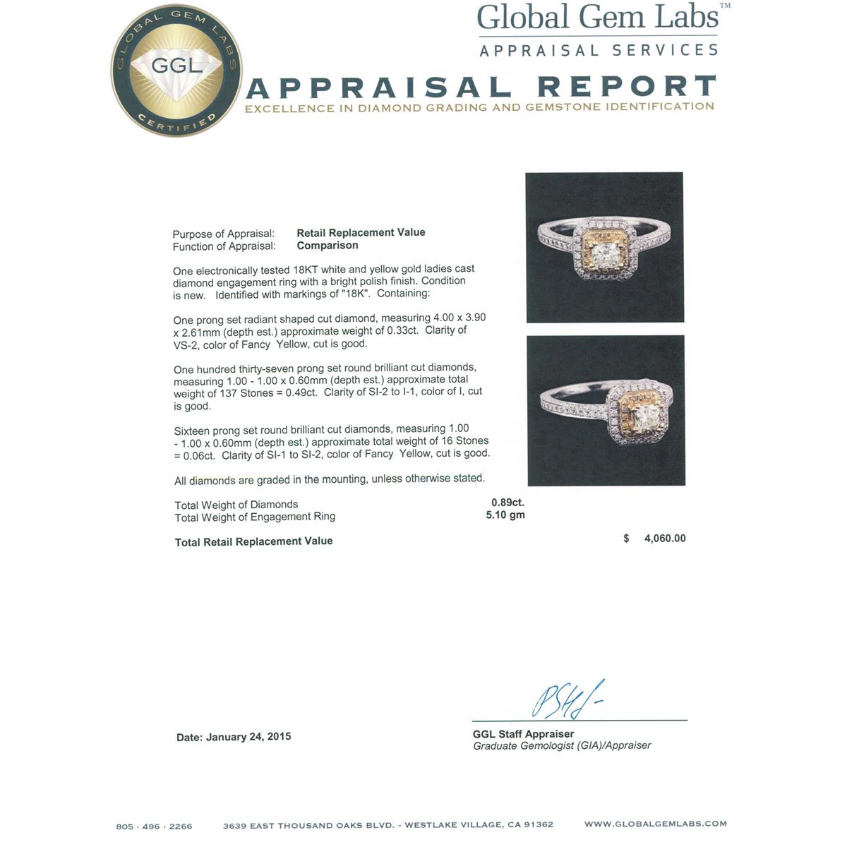 One electronically tested 18KT white and yellow gold ladies cast diamond engagement ring with a bright polish finish. Identified with markings of "18K". Condition is new. Containing: One prong set radiant shaped cut diamond, measuring 4.00. x 3.90 x 2.61mm (depth est.) approximate weight of 0.33ct. Clarity: VS-2, Cut is Good. One Hundred Thirty-Seven prong set round brilliant cut diamonds, measuring 1.00. - 1.00. x 0.60mm (depth est.) approximate total weight of 137 Stones = 0.49ct. Clarity: SI-2 to I-1. Color: I, Cut is Good. Sixteen prong set round brilliant cut diamonds, measuring 1.00. - 1.00. x 0.60mm (depth est.) approximate total weight of 16 Stones = 0.06ct. Clarity: SI-1 to SI-2, Cut is Good. All diamonds are graded in the mounting, unless otherwise stated. Total Weight of Diamonds 0.89ct. Total Weight of Engagement Ring 5.10 grams. GGL Appraised at $4,060.00.